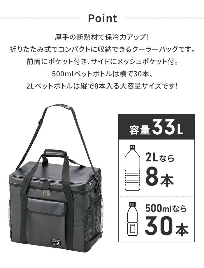 商品情報断熱材厚20mmで抜群の保冷力を実現!500mlペットボトルは横置30本、2Lペットボトルは縦置8本入ります。折りたたみ式でコンパクトに収納可能。前面にポケット、横にメッシュポケットが付いています。▼ 製品サイズ約幅425×奥行295×高さ380mm収納サイズ:約440×390×厚さ115mm▼ 重量約1.6kg▼ 材料本体表生地:PVCターポリン本体内生地:PEVA断熱材:ポリエチレンフォーム中敷き:ポリエステル▼ 特徴・機能折りたたみ式でコンパクトに収納できるクーラーバッグです。厚手の断熱材で高い保冷力があります。500mLペットボトルは横で30本、2Lペットボトルは縦で8本入ります。前面にポケット付き、サイドにメッシュポケット付き。▼ 詳細情報前面にポケット付き、サイドにメッシュポケット付き▼ 生産国中国▼ キーワード保冷バッグ クーラーバッグ 33L 幅42 奥行29 高さ38 ソフトクーラー スーパークールバッグ 折りたたみ 大容量 保冷 冷蔵 フェス アウトドア キャンプ バーベキュー 旅行 レジャー 遊び キャンプ用品 ベランピング おうちキャンプ用品 冷蔵バッグ 公園 デイキャンプ用品 持ち運び コンパクト 収納 ポケット 付き 運動会 スポーツ 大会 ホームパーティー 海 山 川 海水浴 BBQ 花見 アウトドア用品 グッズ