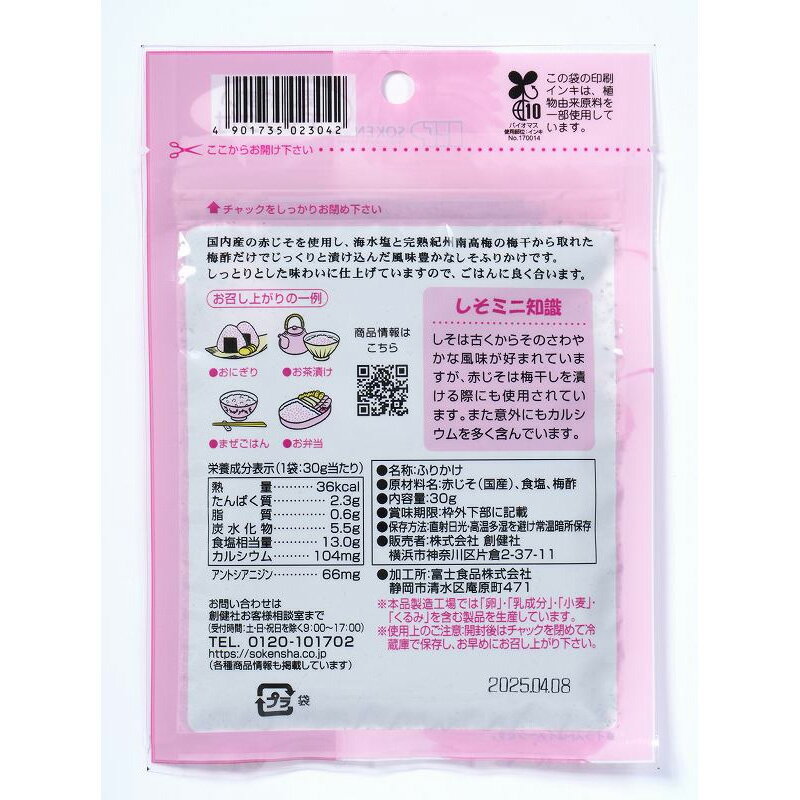 創健社 しそもみじ 30g しそふりかけ 国産 赤じそ 紀州南高梅 おにぎり ふりかけ 使いやすいチャック付き袋入りです ■国産赤じそを使用し、海水塩と完熟紀州南高梅梅干から取れた梅酢だけでじっくりと漬け込んだ風味豊かなしそふりかけです。■しっとりした味わいに仕上げていますので、ごはんに良く合います。■カルシウムを豊富に含んでいます。■着色料・酸味料は使用していません。■使いやすいチャック付き袋入り。■しそは古くからそのさわやかな風味が好まれていますが、赤じそは梅干を漬ける時の色づけにも使われてきました。■赤じそは紫色の色素アントシアニンを含み、意外にもカルシウムも多く含んでいます。 5