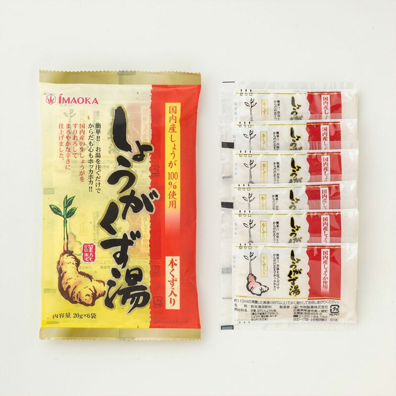 商品情報内容量12袋セット(1袋あたり20g×6袋)今岡製菓 しょうがくず湯(和紙)20g×6袋入 ×12袋セット 生姜湯 国産 生しょうが 本葛 風邪予防 冷え 冷え性 冬の寒いときに最適な一品です 国内産の生しょうがをまるごと使い、国内産の本葛、そのほか砂糖とばれいしょでん粉は北海道産を使用しています。冬の寒いときに最適な一品です。◆おいしいお召し上がり方必ず沸騰している熱湯をご使用ください。1.本品1袋をカップに入れます。2.沸騰した熱湯約110mlをそそぎ、よく溶かしてお召しあがりください。(お好みにより熱湯の量を加減してお召しあがりください。)※製品が底に残りトロミがつかない場合があります。底の方からよくかきまぜてお召しあがりください。※お湯の温度が低いとトロミがつかない場合があります。その際は、電子レンジで1〜2分加熱してください。(加熱時間が長いと、トロミがつきすぎ、召しあがりにくくなりますのでご注意ください。)※熱湯使用の際、やけどをしないようにご注意ください。※開封後はお早めにお召しあがりください。※粉砕したあられを使用しています。 5