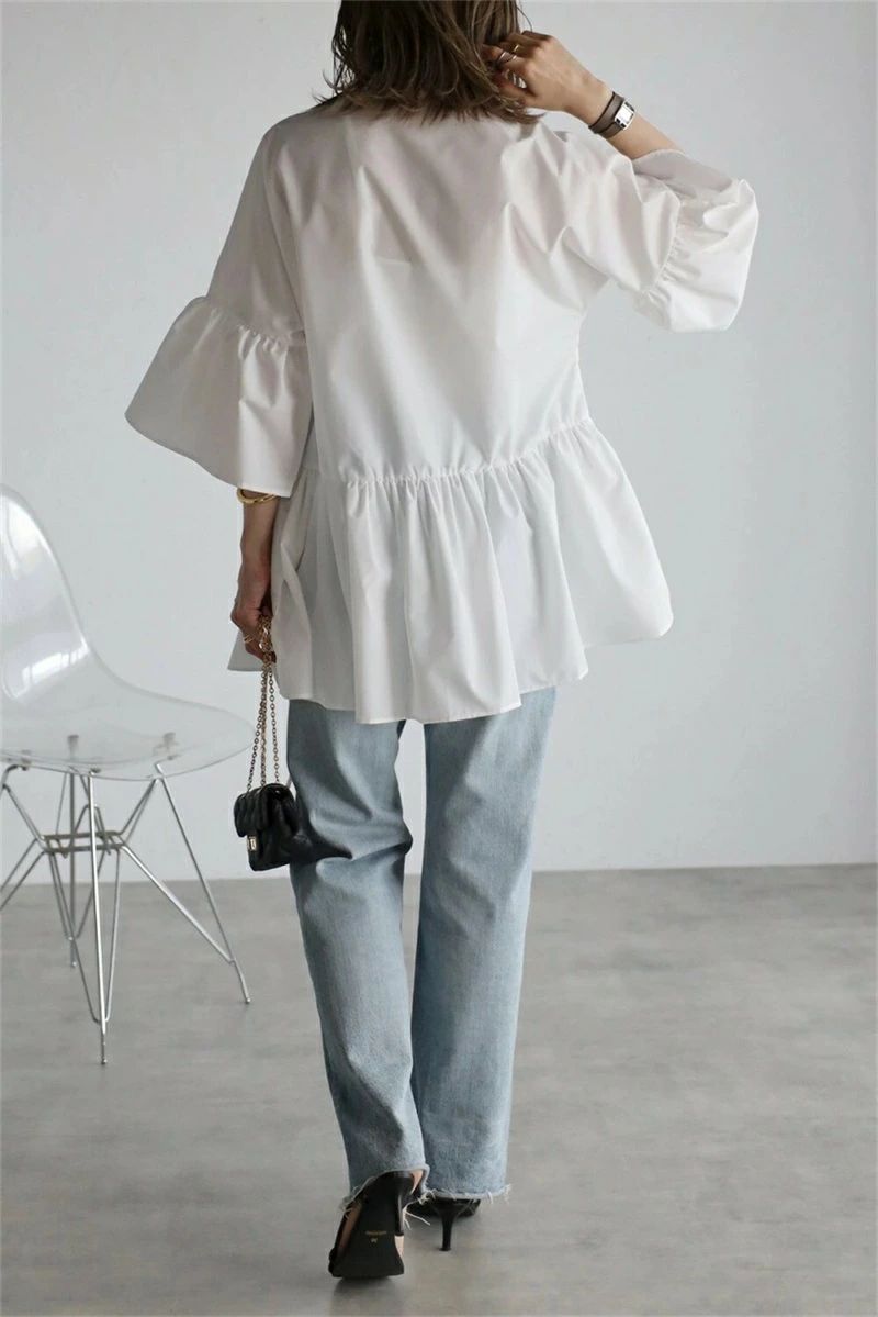 ドルマンシルエットのフレアスリーブに、裾のペプラムフリルがフェミニンなシャツブラウス。 首周りをすっきり見せてくれるバンドカラーネックに、前立ては半分まで開閉可能なプルオーバータイプです。 さらりとした肌触りのシャツ素材で、ややハリがある生地感がフリルをキレイに見せるポイント。 裾のフリルはアシンメトリーデザインで、上級者見えするおしゃれなトップスです。 細見えしながら腕周りやお腹まわりを自然にカバーしてくれる優秀アイテム。