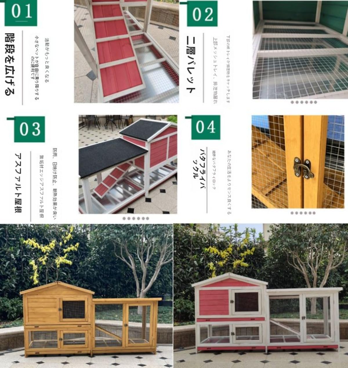 【チキンコープサイズ】-2階建ての超大型スペースチキンコープを採用、組み立て後。下部にあるランニングケージの大きなアクティビティスペースのデザインは、鶏、ウサギ、アヒル、その他の小動物に非常に適しており、4~5羽の鶏を収容できます。【家庭用鶏小屋】:鉄製の鶏小屋は木製の鶏小屋とは異なり、サイズが小さく、家族での使用に適しています。折りたたむのが簡単で、家庭や屋内のペットショップでの使用に適しており、鶏だけでなく、鳩、アヒル、猫、犬、ウサギにも適しています。 鶏小屋は、捕食者による採卵を防ぐために、金網のデザインと施錠可能なドアを備えています。【チキンハウスの特徴】-木造チキンハウス、ランニングケージ、メインハウスはそれぞれ2ドアでデザインされています。トレーとボトムネットが付いているので、鶏は使いやすく、飼い主は毎日お手入れが簡単です。ペットが遊んだり運動したりするためのチキンスタンドとはしごが中にあります。卵の保管と収集を容易にするネストボックスの設計。【長寿命の大型小屋】:この屋外の鶏舎は、高品質の鉄線でできており、環境にやさしいニスで塗装されているため、家にいる動物を安全で健康に保ち、お気に入りのペットに最適です。そして、この養鶏場は耐用年数が長く、ペットに暖かい家を提供することができます。【簡単設置家禽ケージ】この大きな小屋は、ペット愛好家の必需品です。簡単な組み立て手順で作成した養鶏場の品質は数分で作成され、女の子でも簡単に設置できます。折りたためるので収納も簡単です[品質保証]:アイテムを受信したときに、あなたがどんな製品に問題がある場合は、私達に連絡することを躊躇しないでください、私たちは24時間以内に解決策を返信し、あなたを提供します。注意:1.商品のサイズは手作業で測定しているため、1~3cmの若干の誤差はご了承ください。2.モニター、撮影光、その他の要因により、製品の色は写真と若干異なる場合がありますので、ご了承ください。3.私たちは顧客に高品質の製品と優れたサービスを提供することを目指しています。ご質問があれば、お気軽にお問い合わせください。24時間以内に満足のいく回答をさせていただきます。品質サービス:1、 当社の製品に問題がある場合は、お気軽にお問い合わせください。2、輸送中に多少の衝撃が加わる可能性がございます。万が一不具合や破損などがございましたら、部品の再送など対応させていただきますので、お気軽にご連絡くださいませ。3、商品が多いため、発送時に説明書をお送りし忘れることがございます。万が一、説明書が届いていない場合や、商品組み立てに関してご不明点がございましたら、お手数ですがご連絡いただけますようお願い申し上げます。電子版の説明書を再送させていただきますので、どうぞご安心ください。お客様にはご理解いただきますようお願い申し上げます。お客様のご支援が、私たちの励みとなっております。【チキンコープサイズ】-2階建ての超大型スペースチキンコープを採用、組み立て後。下部にあるランニングケージの大きなアクティビティスペースのデザインは、鶏、ウサギ、アヒル、その他の小動物に非常に適しており、4~5羽の鶏を収容できます。【家庭用鶏小屋】:鉄製の鶏小屋は木製の鶏小屋とは異なり、サイズが小さく、家族での使用に適しています。折りたたむのが簡単で、家庭や屋内のペットショップでの使用に適しており、鶏だけでなく、鳩、アヒル、猫、犬、ウサギにも適しています。 鶏小屋は、捕食者による採卵を防ぐために、金網のデザインと施錠可能なドアを備えています。【チキンハウスの特徴】-木造チキンハウス、ランニングケージ、メインハウスはそれぞれ2ドアでデザインされています。トレーとボトムネットが付いているので、鶏は使いやすく、飼い主は毎日お手入れが簡単です。ペットが遊んだり運動したりするためのチキンスタンドとはしごが中にあります。卵の保管と収集を容易にするネストボックスの設計。【長寿命の大型小屋】:この屋外の鶏舎は、高品質の鉄線でできており、環境にやさしいニスで塗装されているため、家にいる動物を安全で健康に保ち、お気に入りのペットに最適です。そして、この養鶏場は耐用年数が長く、ペットに暖かい家を提供することができます。【簡単設置家禽ケージ】この大きな小屋は、ペット愛好家の必需品です。簡単な組み立て手順で作成した養鶏場の品質は数分で作成され、女の子でも簡単に設置できます。折りたためるので収納も簡単です[品質保証]:アイテムを受信したときに、あなたがどんな製品に問題がある場合は、私達に連絡することを躊躇しないでください、私たちは24時間以内に解決策を返信し、あなたを提供します。注意:1.商品のサイズは手作業で測定しているため、1~3cmの若干の誤差はご了承ください。2.モニター、撮影光、その他の要因により、製品の色は写真と