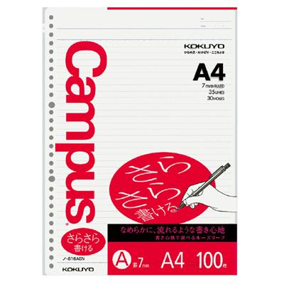 色々な筆記具に対応し、裏抜けしにくく、にじみが少ない、とても書きやすいルーズリーフ。 学校で、仕事で、プライベートで、毎日ストレス無くお使いいただける便利で品質良い製品です。 【特長】 ・見分けやすいカラーリーフ ・さまざまなメディアテストを重ね、書き心地を追求。 ・計画的に植林された樹木パルプを主原料とした環境配慮仕様。 【商品仕様】 ■本体サイズ: B5 縦257×横182mm ■本文: メモリ入6mm罫/36行/60枚 ■用紙: 筆記用紙 MPS-N 80g/m2 ■穴数: 26穴