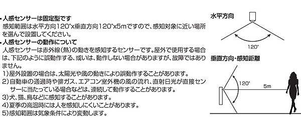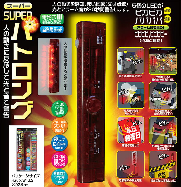 人に反応して光と音で警告! 防雨・防塵(IP4)人感LED回転灯 スーパーパトロング SLB300 侵入者への威嚇、警告以外にも、例えば車の入出庫時の注意、立ち入り禁止区域への接近警告など、アイディア次第で様々な用途で使用できます。 Feature 1 人の動きを感知し、赤いLEDの回転(又は点滅)とアラーム音が20秒間警告を発します 人が監視エリアにいる間は連続動作します。 Feature 2 乾電池駆動(単3形アルカリ電池x3本)なので配線不要で設置簡単 ※電池は別売りです。 Feature 3 検知角度は120°、5m以内の近距離を監視、監視域に接近すると警告します Feature 4 動作時間を夜だけ動作、24時間いつでも動作に切り替えられます Feature 5 電池寿命は光のみの場合で約6ヶ月、音と光の場合で約3ヶ月持続 Feature 6 光の点滅のみ/光の流動のみ/光の点滅+アラーム音の3通りから動作を選択可能 Feature 7 屋外(壁面・鉄柱・鉄板)、屋内(壁面・金属面)等に設置可能 人感センサーについて ボタンと機能 使用上のご注意 1・猛暑時は感度が極端に悪化し、動作しない事もございます。 2・屋外設置で太陽光のあたる場所を監視する場合は暖かい風の動きで誤動作する事がございます。 3・ガラス越しでは使用できません。 SLB-300 仕様 電源 単3形アルカリ電池x3本(別途お求めください) 電池寿命 1日10回(20秒間/1回)動作時、光のみで約6ヶ月、 光とアラーム音(最大)では約3ヶ月。 動作時間 1回の動作は20秒間。人が前で動いていると連続動作します。 電源OFF スイッチあり 人感センサー 120°×最大5m程度まで。横切る方向では感度良く、 近づいてくる方向では感度が鈍くなります。 LED数 赤LED×5個 アラーム音量 大:90dB/1m、小:55dB/1m 点灯条件 夜:60ルックス以下の暗い時だけ動作 24時間:いつでも動作 設置場所 屋外/ 室内(壁面又は鉄柱・鉄板などに設置) / IP43(防雨形) 本体材質 ABS樹脂 外形寸法 W220xD24.5xH39mm(突起物を含む) 質量 約95g(電池を含まない質量) ※外観及び仕様は予告なく変更することがあります。