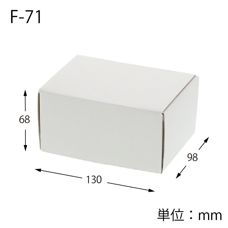 ギフトにも使える 薄い段ボール製のボックスです! 薄い段ボール製で丈夫なので、収納や発送、ギフトと幅広い用途にお使いいただけます。 豊富なサイズが揃っています。 ●入り数:10枚 ●サイズ:幅130x奥行98x高68mm(内寸) ●材質:白Eフルート段ボール ●再生紙使用 *表面に光沢はありません。 内側は段ボールの色(薄茶)になります。 *この商品はF-51(幅60x奥行60x高90mm)の中にぴったり2個入ります。 *お客様が組み立てるタイプのボックスです。 (組み立て前の状態でのお届けとなります。) 【環境配慮商品】 再生紙を 使用しています 【ご注意ください】商品に在庫数が表示されていない商品は自社販売と在庫を共有しているため、品切れとなる場合があります。また予告なくメーカー廃番となる場合があります。白無地タイプのボックスです。マグカップやグラス、灰皿など、小物に対応できる小さいサイズが中心となっています♪ 組み合わせ次第で、外箱に内箱2つをぴったり収納することができます!! ◆組み合わせ一覧表◆ 外箱 内箱 F-71(内寸:98x130x68mm) → F-51(内寸:60x60x90mm)×2個 F-72(内寸:108x140x73mm) → F-52(内寸:65x65x100mm)×2個 F-73(内寸:112x150x78mm) → F-53(内寸:70x70x105mm)×2個 F-74(内寸:120x162x83mm) → F-54(内寸:75x75x110mm)×2個 F-75(内寸:132x170x88mm) → F-55(内寸:80x80x120mm)×2個