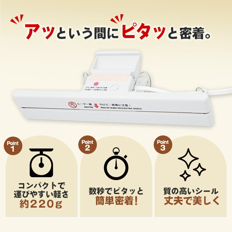 ●シールサイズ:幅2mmx長さ200mm ●本体サイズ:幅72mm×225mm×47mm ●電源:AC100V ●本体材質:ABS樹脂 ●本体重量:220g ●コードの長さ:2m ●付属品:交換用フッ素樹脂テープ2回分 ■消耗した場合交換が必要な部品■ ・ヒーター線(5000回程度の使用で要交換) ・フッ素樹脂テープ(1000回程度の使用で要交換) ※2回分は本体に同梱されています。 ■シール可能な材料■ ・ポリエチレン(PE) ・ポリプロピレン(PP) ・塩ビ ・不織布のネット ・PEを内側にラミネートした複合フィルム (全て一片面0.1mmまで) ※ナイロン単体、ポリエステル単体など、ポリエチレンでラミネートされていないものはシールできません。※エアキャップ(プチプチ)など空気の入った緩衝材は推奨しておりません。※マチがある袋、特殊圧着が施されている袋は、シール出来ない場合があります。 ※厚手のものをシールする時は、手や指でヒートシーラー本体にしっかり圧力を加えながら袋をシールしてください。 ※注意事項※ パッケージ変更の為お手元に届く商品に旧型または新型が届く場合があります。 また、変更・指定等は受付けておりませんので予めご了承ください。 ※プラスチックカバーで全体が覆われて熱がこもり易いので、長時間連続使用には適しません。 【関連キーワード】 クリップシーラー ヒートシーラー フードシーラー 家庭用 シーラー 本体 正規品 小型 軽い 手軽 コンパクト 軽量 持ち運び 簡単 操作簡単 保存 鮮度長持ち お菓子作り 手作り 簡易包装 野菜 冷凍 冷蔵 調理 キッチン エコ ギフト プレゼント ラッピング 密封 密閉 パウチ 梱包 ネット資材 新築祝い 結婚祝い 引っ越し祝い 母の日 敬老の日 父の日 誕生日 推し活 おしかつ グッズ 手芸 しゅげい 装飾 手作り ハンドメイド オリジナル コレクション おすすめ 人気 ランキング 1位 レビュー かわいい 可愛い お洒落 オシャレ シンプル 無地 白 ホワイト コンセント ボタン タイマー インテリア 家具 アレンジ リメイク 雑貨 コレクション コレクター 趣味 集める 収集 料理 カレー シチュー 汁物 味噌汁 スナック お菓子 作り置き 安い 格安 お得商品はこちら >> 商品はこちら >> 商品はこちら >> 商品はこちら >> 商品はこちら >> 商品はこちら >> ■■商品の特長■■ ●袋を立てた状態でシールできるので、水物・液体にも対応できます。 ●質の高いシールができるため、少量の業務用包材に最適です。 ●シールをつなげて行うことで、大きな袋作りにも対応できます。 ●ご家庭にて、多量の食材を小分けにし、長期間保存できます。 ●誕生日プレゼント、ギフト、贈答品としてもご好評頂いています。