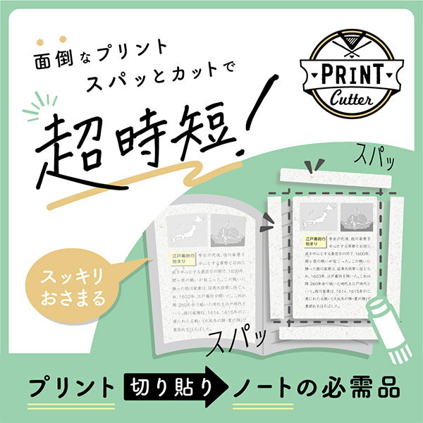 面倒なプリントカットもスパッと超時短! プリント整理・ノート作りの必需品!プリントカッターです♪ ・カットガイドを使えば、A4&B5プリントの四辺カットが超カンタン。 一般的なB5サイズのノートへの貼り付けが時短できます。 ・レール定規を固定できるシリコンバンド付。 勝手に開いたり誤って刃が触れる心配がありません。 ・プリントは最大5枚まで同時にカットできます。 ★替え刃は「SP-8531 プリントカッター 専用替え刃 2個入」をお求めください。(※替え刃のカラーはグリーンのみ) 【商品詳細】 ●サイズ: 商品:100×362×38mm 盤面:100×310mm パッケージ:410×130×45mm ●材質:主要材質=本体=ABS