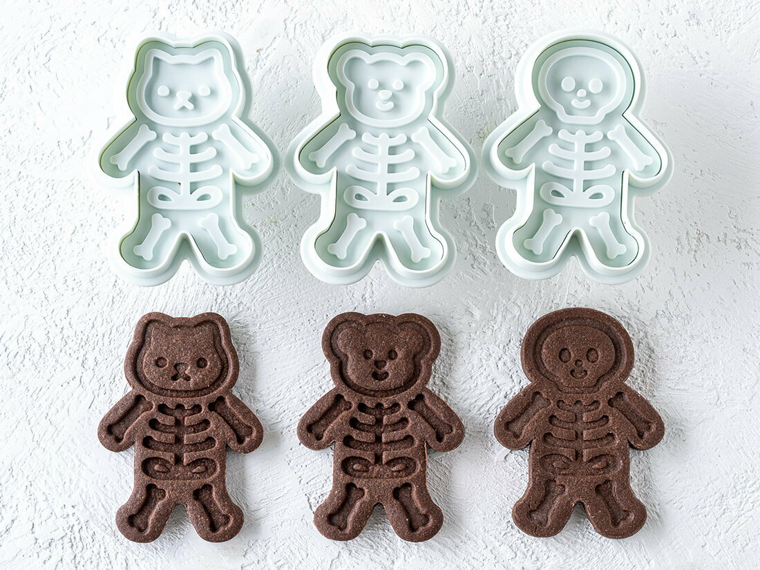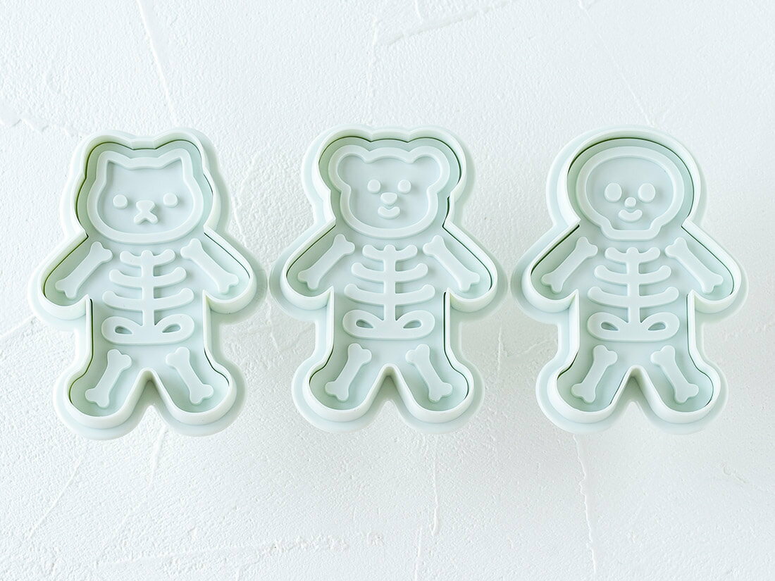 一個当たり 約58×82mm素材 ABS製造地 中国cottaオリジナルのスタンプクッキー型です。かわいいキャラクターたちが、ホラーマンに仮装しています。ユニークでキュート!ほねほね模様のスタンプクッキーワンプッシュするだけで模様を簡単につけられるので、焼きっぱなしでかわいいクッキーができちゃいます。スタンプクッキー型の使い方クッキー生地は、3mmルーラーで厚みをそろえてのばしましょう。強力粉をつけて余分な粉を落としたクッキー型を押し当て、模様をつけるために突起部分を強めにプッシュ。 170℃に予熱したオーブンで約15分間焼成します。焼きっぱなしでもかわいいみんなの人気者、ネコちゃんやくまちゃんがスケルトンに!ちょっぴりホラーでかわいいデザインがインパクト大♪他のスタンプクッキー型シリーズに比べて、大きめサイズになっています。アイシングやチョコでアレンジくぼんだ部分にアイシングやチョコレートを流せば、模様がくっきりとしてよりキュートに♪分解して洗えるクッキー型は写真のようにバラして、洗って乾かしたらまた元通り組み立てるだけ!プッシュ部分とバネはセットにしたまま、乾くまで大切に保管しておきます。バネはなくさないように気を付けてくださいね。商品情報一個当たり:約58×82mm素材:ABS食洗機:不可電子レンジ:不可オーブン:不可耐熱温度:90℃ 耐冷温度:40℃製造地:中国cottaオリジナルのスタンプクッキー型です。かわいいキャラクターたちが、ホラーマンに仮装しています。