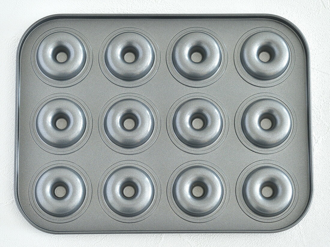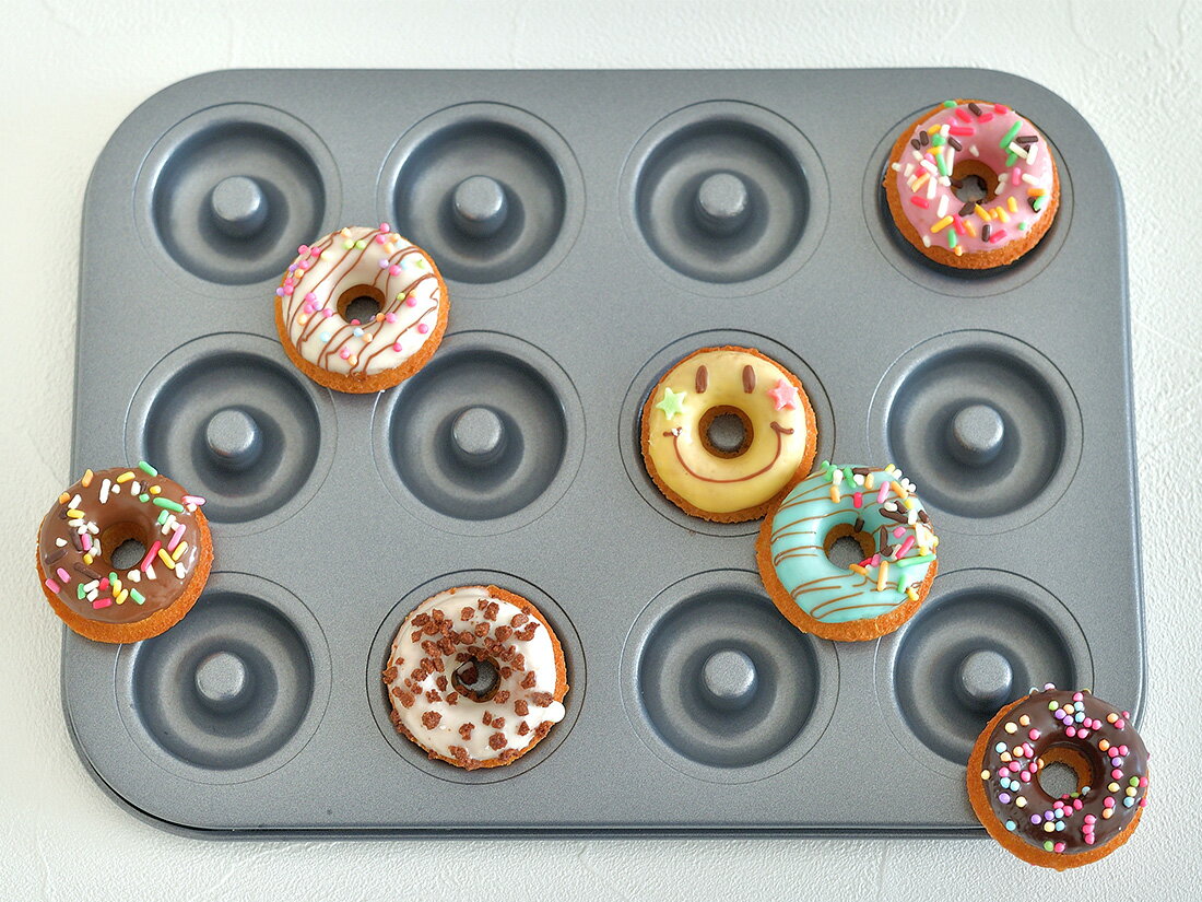 1購入当たりの内容量 : 1個[規格]265×195×H17.8mm[素材]スチールにシリコン加工[製造地]中国[外寸]265×195×H17.8mm [一個当たり]直径約42mm[機能・特徴]ミニサイズの焼きドーナツが1度に12個作れる型です。シリコン加工してあるので、型離れが良いです。[耐熱温度]220℃〜マイナス20℃かわいさ爆発♪絶対買うべき‼ミニ焼きドーナツ型ありそうでなかった!一度に12個焼ける、ミニサイズのキュートなドーナツ型です。金型なので、そのままでもとってもおいしそうな焼き色がつきます。レシピやデコレーション次第でどんなドーナツにも大変身♪直径4cmのミニサイズ一口サイズで食べやすく、見た目もかわいいミニサイズです。オーブンに入れて約8分で焼き上がり。焼成時間が短いので量産にもおすすめ。作り方は簡単!ワンボウルで混ぜるだけ【1】ボウルに卵、きび砂糖、水あめ、バニラオイル、牛乳を入れてホイッパーでよく混ぜる。【2】粉類をふるい入れる。【3】粉が見えなくなるまで混ぜる。【4】溶かしバターを入れて混ぜる。【5】型に生地を入れる。※絞り袋があると便利です。【6】180度で約8分間焼成し、型から取り出して冷ます。※ご家庭のオーブンによって焼成温度や時間は変わります。目安としてお考えください。使用前には必ず油脂を塗ってください型に塗る油脂は液体油脂ではなく、やわらかくしたバターかスプレーオイルを使用してください。型離れが悪いと感じる際は、型に油脂を多めに塗ることで改善される可能性があります。お手入れ方法使用後は洗剤で洗わずに、基本的に軽く拭くだけにし、型に油分を残すようにするとシリコンが長持ちします。お子さまと一緒に楽しめるチョコペンを使うとお子さまでも簡単にデコレーションすることができます。色とりどりのドーナツにほっこり。