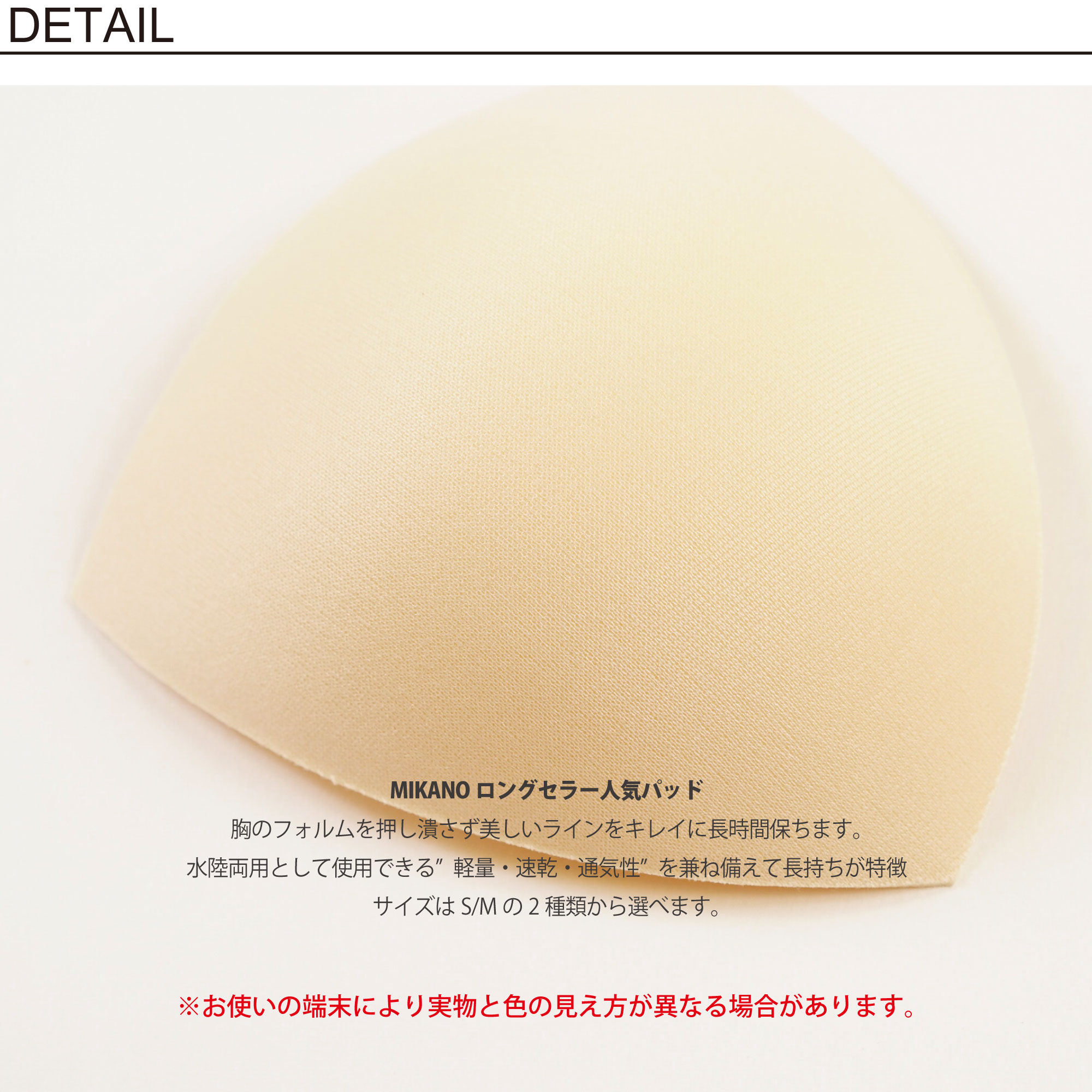 MIKANOロングセラー人気パッド 胸のフォルムを押し潰さず美しいラインをキレイに長時間保ちます。 水陸両用として使用できる”軽量・速乾・通気性”を兼ね備えて長持ちが特徴 サイズはS/Mの2種類から選べます。 ◆商品写真はできる限り実物の色に近づけるよう徹底しておりますが、お使いのモニター設定、お部屋の照明等により実際の商品と色味が異なる場合がございます。 【サイズ】 S A:12cm/B:12.8cm/C:11.2cm/厚さ:0.4cm M A:14cm/B:12.8cm/C:12.6cm/厚さ:0.4cm 【素材】 ポリエステル 【お取り扱い上の注意】 ・使用後は色あせ、生地の傷みを防ぐ為、必ず真水ですぐに押し洗いをして下さい。 ・長くお使い頂く為にも手洗いをお勧めします。 ・洗剤をお使いの場合は中性洗剤、無蛍光洗剤をお勧めします。 ・製品についている洗濯ネームもご参照下さい。 ・陰干しにして自然乾燥して下さい。縮みの恐れがある為、乾燥機のご使用はご遠慮下さい。 【ネコポス対応商品】 ・1点のみ発送可能です。(複数注文の場合は宅配便に変更いたします) ・ご利用は対象商品に限ります。 ・代引き支払い及び日時指定をご利用の場合は通常配送となります。 MIKANOの全ての商品はこちらより トップス パンツ その他