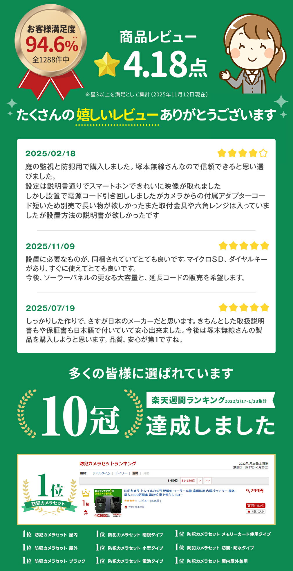 メーカー希望小売価格はメーカーカタログに基づいて掲載しています ソーラー給電カメラ特集 屋外の害獣監視や野生動物の観察に最適な「トレイルカメラシリーズ」。 外部電源不要で、単三電池だけで長時間稼働可能。ソーラーパネル給電にも対応しており、設置場所を選びません。 広範囲をカバーできる高感度モーションセンサーを搭載し、動きを検知すると自動で撮影。夜間は赤外線撮影により鮮明な白黒映像を記録します。 カメラ本体にモニターを内蔵しており、録画データをその場で確認可能。さらにAPモード対応機種では、スマホで直接映像をチェックできます。 ストラップ付属でポールや木に簡単に固定でき、農地の害獣対策や自然観察カメラとして人気の屋外用トレイルカメラです。 【屋外設置OK】IP66防水防塵で雨風に強い防犯カメラ 【農作物を守る】害獣対策におすすめの屋外カメラ 【電源不要】単三電池・ソーラー対応でどこでも設置可能 【赤外線センサー搭載】夜間も自動撮影で被害を見逃さない 防犯に必要な機能がこの1台(トレイルカメラ)に 乾電池とソーラーパネルで動作するから、外電源は一切不要 置くだけですぐに使えるから防犯カメラの設置費用などを 節約することもできます トレイルカメラ(ソーラー対応)でできること ・驚きの4K映像&2000万画素の静止画 ・ソーラーパネルで動作するから外電源不要 ・乾電池で動作するから外電源不要 ・乾電池で最長12ヶ月連続待機OK ・PIR(人感)センサーで映像を撮り逃がさない ・防犯カメラと違って設置が簡単、置くだけ! ・日本語完全対応 ・MicroSDへの録画もできる ・内部モニターでその場でカメラ映像を確認 ・赤外線LEDで夜間の撮影もばっちり ・インターバル撮影で定点観察もできる ・IP56相当の防塵防水性能 【塚本無線のトレイルカメラ(防犯カメラ)】 とっても簡単!3つの設置方法 ベルトで固定して、平地に直置き、付属パーツで 壁に固定など簡単にトレイルカメラを設置すること ができます このトレイルカメラ1台に必要な機能が全部入り 防犯に必要な「撮る」「見る」「残す」の3要素を このトレイルカメラ1台で解決します 4K映像、2000万画素の静止画 超鮮明な4Kで映像を確認することができます 静止画は2000万画素とさらに鮮明な写真を撮影できます PIRセンサーで自動録画 撮影の瞬間を撮り逃がさない 撮影まで最短0.2秒、広範囲の人感センサーで周囲と温度差の ある人や動物を素早く感知、録画を開始します 動きを検出していないときはスタンバイモードになり 電池の消費を抑えます 電源ケーブル不要、乾電池で動作 乾電池で動作するので、電源の確保できない場所でも トレイルカメラを運用可能 設置も簡単にでき、防犯カメラの知識がない方でも手軽に 設置ができます ソーラー充電対応で外電げ不要 オプションのソーラーパネルを利用すれば、電池切れの 心配なくトレイルカメラの運用ができます。 内蔵バッテリーの充電方法は2種類 ソーラーパネルなら重要な場面でのバッテリー切れを気にする ことなくトレイルカメラの運用が可能 (*ソーラーパネル別売り4,000円) 撮影された映像をその場で確認 トレイルカメラはモニターと録画機能が本体に搭載されて いるため、撮影した映像をその場で確認することが可能 最大128GBMicroSDカードに保存 トレイルカメラの映像はMicroSDカードへ保存ができ 付属のケーブルを利用して映像をPCやテレビへ出力 することもできます 赤外線で夜間もくっきり 赤外線LEDを46個搭載し、最大で20m先まで映像を確認 することができます 昼夜の撮影モードは自動で切り替わり、夜間はモノクロ で撮影となります インターバル撮影 決まった間隔で静止画・動画を撮影するインターバル 撮影に対応 屋外への設置も安心 IP65相当の防水性能があるので、屋外への設置も 安心してできます ※デザイン・スペック・仕様・機能などは予告なく変更となる場合がございます。※ACアダプターには防水性能はございません。水濡れでショートする場合がございます。※詳しい注意事項についてはこちらをご覧ください 防犯カメラ トレイルカメラ 屋外 電池式 ソーラー ワイヤレス SDカード録画 監視カメラ 小型 家庭用 車上荒らし ガレージ 駐車場 獣害 防水 夜間 撮影 防犯 玄関 マンション アパート 一軒家 一戸建て 置き型 スマホで監視 wifi対応 電池式 APモード SDカード録画 インターネット不要 コンセント不要 害獣 食害 動物 熊 くま イノシシ 猪 鹿 狸 たぬき 狐 きつね アライグマ キョン CL4)4200万画素APモデル WTW-TC31AP CL5)4600万画素APモデル WTW-TC32AP CR8)車載トレイルカメラ WTW-IV1 CU1)小型トレイルカメラ WTW-TC8 4800万2.7K動画APモデル WTW-TC2792AP CT3)ソーラーパネル一体型 WTW-TCS36AP [A015]家庭用ソーラー WTW-TRC2532-SOR(6M) [A062]WTW-SOR2093P-12 [A064]WTW-SOR2093P-21 [A081]WTW-SOR2932-8 日本製防犯カメラを国内自社工場開発生産できる塚本無線です。AP接続時の保存データ量についてご注意 AP接続時は、最新ファイルから過去1000ファイルを確認できます。1