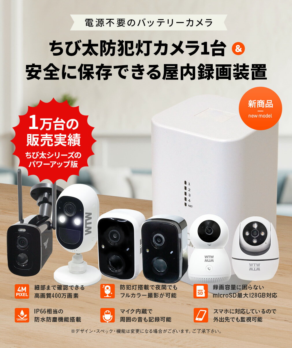 ソーラー給電カメラ特集 デザイン性と機能性を兼ね備えた「ちび太シリーズ」 は、屋外でも室内でも使えるソーラー対応の小型防犯カメラ。 卓上タイプとバレット型の2種類から選べ、防犯カメラ特有の「いかつさ」を抑えたデザインで、インテリアになじみやすいのが特長です。 400万画素の高画質に加え、防犯灯によるカラー撮影・赤外線撮影に対応。昼夜問わず鮮明に映像を記録します。ソーラー給電対応で、配線工事が難しい場所でも簡単に設置可能。IP66相当の防水防塵仕様で屋外でも安心です。 マイクとスピーカーを搭載し、スマートフォンやPCから双方向通話が可能。外出先からペットや家族に声をかけたり、不審者に警告することもできます。MicroSDカード録画対応に加え、録画機と接続すれば長時間録画も可能。 「かわいい見た目でしっかり防犯」「卓上で置くだけ設置」など、使う人に合わせた選択肢を用意したおしゃれな見守り・防犯カメラが「ちび太シリーズ」です。 【ペットの見守りに最適】留守中の猫や犬の様子をスマホで確認 【外出先からも安心】ペットの動きを自動追跡する見守りカメラ 【声かけ機能搭載】双方向通話でペットとコミュニケーション 【高齢の家族を見守れる】離れて暮らすご両親の安心サポート 【遠隔で安否確認】スマホから簡単チェック 【双方向通話対応】ご家族との会話も可能で安心 【子どもの安全を守る】留守番中もスマホで様子を確認 【暗い部屋でも安心】赤外線&低照度撮影で夜間も鮮明 【双方向通話対応】「宿題やった?」と声かけできる見守りカメラ 【簡単設置】無線接続で配線不要、届いた日から使える 【工事不要】電源を入れてすぐ使える家庭用防犯カメラ 【誰でも使いやすい】スマホアプリから簡単操作 【バッテリー充電式 防犯カメラセット登場!】 屋外・屋内どちらにも対応! しっかりお家を監視できる1台セット 1.専用の無線式録画機でかんたん設置 専用録画機で映像をまとめて録画&保存! カメラと録画期間の配線が不要だから 長距離接続もラクラク 2.選べる給電方法 バッテリー給電、ソーラー給電、コンセント給電が可能! 環境に合わせて給電方法を選べるから設置がしやすい 3.アンテナ内蔵モデル スマートですっきりした外観を実現 塚本無線独自機能で アンテナ内蔵でも安定した通信が可能 4.スマホ・PC対応 リアルタイムの映像や過去の録画映像は スマホアプリやPCからいつでもどこでもチェック 5.400万画素の高画質撮影 人の顔や車のナンバーまで はっきりと撮影できる高画質撮影 6.明るく照らす防犯灯カメラ 人が通るとLEDセンサーライトが点灯 高い防犯効果を発揮します。 さらに夜間のカラー撮影にも対応 7.人感センサー(PIR)対応 熱のあるものに反応して撮影を開始するので バッテリーを節約する事ができます。 8.防水・防塵設計 防塵防水設計だから、屋外へ設置しても大丈夫! 9.マイク内蔵で音声も記録 マイク内蔵だから現場の音声もしっかり記録 ※デザイン・スペック・仕様・機能などは予告なく変更となる場合がございます。※ACアダプターには防水性能はございません。水濡れでショートする場合がございます。 【ご注意】 ・ソフトバンクAirやポケットWi-Fiではご利用できない場合がございます。 ・遠隔監視をするにはインターネット環境が必要です。 ・2.4GHz対応、5GHzは非対応です。 ・IPv6は非対応です。 ・一部のタブレット端末ではご利用になれない場合がございます。 ・カメラの初期設定にはスマートフォンが必要です。 ※デザイン・スペック・仕様などは変更となる場合がございます。※ACアダプターには防水性能はございません。水濡れでショートする場合がございます。※詳しい注意事項についてはこちらをご覧ください 【ご注意】 ※CMSを利用したリアルタイム監視の際は、サーバーの混雑を防ぐため約10分で接続が自動的に切断する仕様となります。 ※常時録画をするにはカメラを電源コンセントに繋いで、インターネット接続のあるWi-Fiルーターに録画機を有線接続していただく必要がございます。 cat_ちび太シリーズ 防犯カメラ 屋内 監視カメラ 留守 簡単設置 家庭用 業務用 バッテリー 外出 防犯対策 家庭 自宅 マンション アパート オフィス 学校 ガレージ 玄関 ゴミ置き場 ゴミ捨て場 いたずら防止 ベランダ インターホン 一戸建て 不審者 会社 業務用 玄関 高画質 室内 長時間 録画 店舗 天井 200万画素 セキュリティ 手軽 ソーラー バッテリー バレット スマホで監視 wifi対応 充電式 SDカード録画 センサーライト WTW-EAGLE コンセント不要 防犯灯 WTW-EG1980SY ちび太PRO黒 WTW-E2635B ちび太PRO黒(E2634B) WTW-E2634B ちび太防犯灯EGW1724W WTW-EGW1724W みてるちゃん2 5Plus WTW-IPW188W-5 WTW-T1 WTW-T2 軽量ソーラーパネル(WTW-SOR2106B-3C)【※製品保証6ヶ月】 軽量ソーラーパネル(WTW-SOR2634)【※製品保証6ヶ月】 軽量ソーラーパネル(WTW-SOR2106B-1724(6M))【※製品保証6ヶ月】 大容量12000mAhバッテリーパネル(WTW-SOR2093B-12)【※製品保証6ヶ月】 大容量21000mAhバッテ