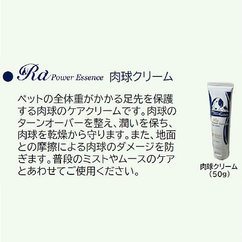 お店TOP>ケア用品>皮膚・被毛>皮膚>Raパワーエッセンス パウクリーム (50g×2セット)【Raパワーエッセンス パウクリームの商品詳細】●Raパワーエッセンスは、大学と獣医師の長年の研究により生まれたペットケア商品です。●5つの国産成分(玉川温泉水、月桃水、へちま水、パイン水)と超高濃度活性水素水を特定の比率(黄金比)で配合することにより、ペットの全身ケアに優れた特性をもたらすことが確認されました。●目や口に入っても問題ない日本製のペットケア商品です。●パウクリームはペットの全体重を支える足先を保護する肉球用のケアクリームです。●肉球の潤いを保ち乾燥から守ります。●地面との摩擦による肉球のダメージから守ります。●普段のスプレーやムースのケアと合わせてご使用ください。【使用方法】・保湿作用の高いクリームですので、ペットの肉球の状態が気になったときにお使いください。・普段のスプレーやムースの全身ケアとあわせてご使用いただくと効果的です。【成分】玉川温泉水(北投石温泉)、月桃水、へちま水、パイン水(松樹液水)、超高濃度活性水素水、グリセリン、メタケイ酸、ミネラル、アミノ酸、カロチン、ピクノジェノール【注意事項】・本品はペット用ケア商品です。・小児やペットの手の届かない場所に保管して下さい。・目に入ったらすぐに洗い流して下さい。・開封後は出来るだけお早めにお使いください。・直射日光の当たる場所、極端に高温や低温になる場所には保管しないで下さい。・天然由来成分から構成されておりますので、稀に変色が起こる場合がありますが、製品の品質に問題はございません。【発売元、製造元、輸入元又は販売元】薬草研究所HERBS(株)※説明文は単品の内容です。リニューアルに伴い、パッケージ・内容等予告なく変更する場合がございます。予めご了承ください。・単品JAN:4571238170019・JAN:606643薬草研究所HERBS(株)富山県氷見市阿尾43-30120-358-393広告文責:楽天グループ株式会社電話:050-5306-1825[皮膚・被毛]