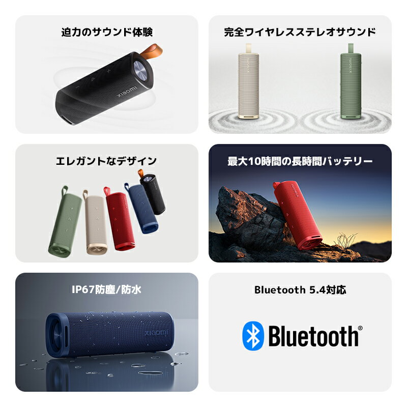 スペック 名称:Xiaomi サウンドアウトドア モデル:MDZ-38-DB カラー:ブラック/ブルー/レッド/ゴールド/グリーン 製品寸法:196.6mm × 68mm × 66mm 重量:約597g 定格出力電力:1×20W、1×10W 周波数帯:60Hz~20KHz 信号対ノイズ比:80dB以上 バッテリー:リチウムイオン、7.2V、2600mAh バッテリー充電:5V 3A、2.5時間 Bluetoothバージョン:5.4 転送距離:25m 再生時間:約12時間(50%の音量での使用時) 防水防塵性能:IP67 ステレオペア(TWS):対応 マルチスピーカーペア:対応、最大100台 マイク:対応 パッケージ内容 Xiaomi サウンドアウトドア × 1 充電ケーブル ×1 取扱説明書 × 1