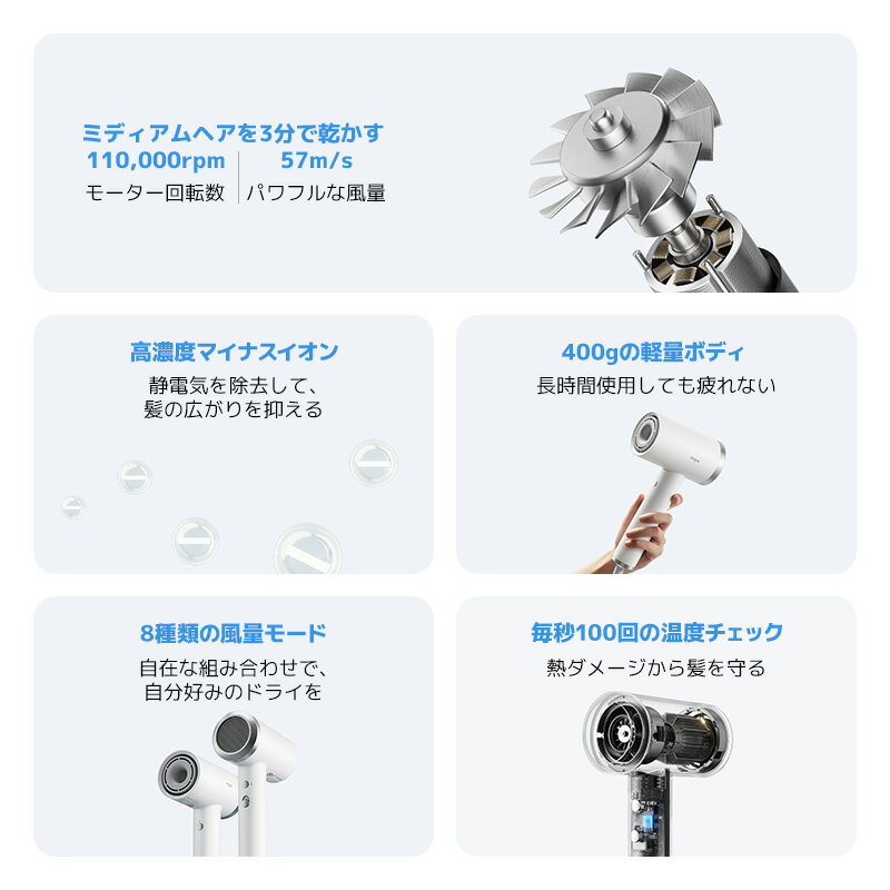 【新発売!】Mijia 速乾イオンヘアドライヤー ヘアドライヤー 大風量 速乾 時短 低温ドライヤー 高濃度マイナスイオン 1200W 高速ドライヤー 軽量 静音 8種類の風量モード 静電気除去 コンパクト 人気 髪質改善 美容家電 ヘアケア 美髪 ドライヤー