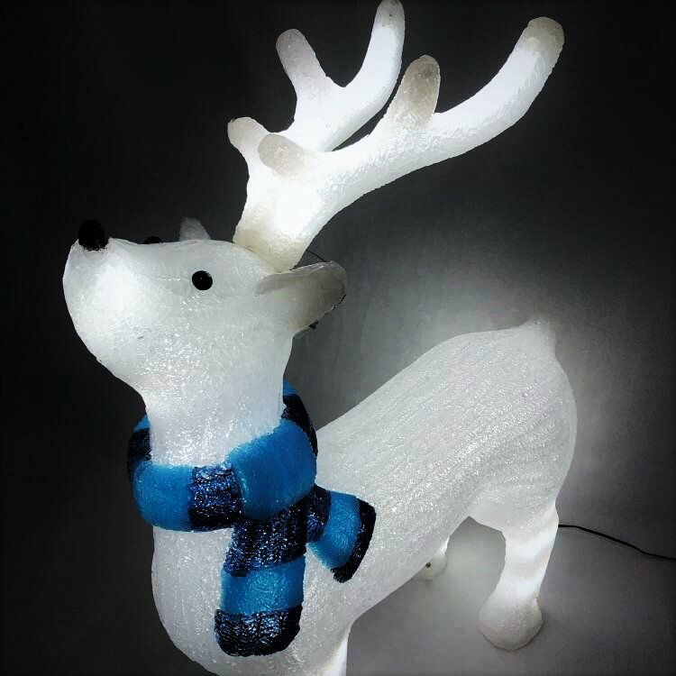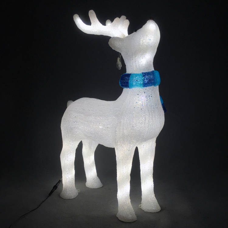 可愛い目で見上げるポーズが人気のトナカイのLEDイルミネーション。ブルーのお洒落なマフラーをしたPOPなトナカイです。 真っ白なクリスタルボディーの中からLEDホワイトの光が全体的に映し出し玄関にピッタリのイルミネーションです。 寸法 高さ:65cm 横幅:22cm 長さ:50cm。消費電力:10W。 クリスタルモチーフですから点灯していない昼間でもオブジェとしてもお使カラーいいただけます。 屋外仕様ですのでベランダ・お庭にも置いて頂けます。 組み立て不要・・・コードを接続するだけ。電源:AC100V使用 PSE防水丸型12Vアダプター・電源コード約2m付。LEDホワイト。 常点。 消費電力:10W。 材質はプラスチッククリスタル。 転倒防止用ピン付。 屋外/屋内使用可能 電気代の目安 消費電力10W 1日あたりの使用時間:(仮定6時間使用) 1日あたりの電気代:約2円 1ヶ月あたりの電気代:約60円 ※地域・契約により変わりますのでご了承願います。 (参考2024年電気代シュミレーター) クリスタルイルミネーションの特徴 ボディーのプラスチックを特殊加工することにより中のLEDの光源を斑なく全体に光を映し出します。 表面に空気を通る隙間があることによりブロータイプに比べて風の通りがよく風圧を軽減してくる為倒れにくいのが特徴。 LEDの幻想的な光がクリスタル全体的に映し出されご家族全員でお楽しみいただけるお勧めのイルミネーションです。 このクリスタルイルミネーションに可愛いカラーを施し夜はもちろん明るい昼間でも存在感を発揮。 点灯していない昼間でもオブジェとしてもお使い頂けます。 組立・使用等はいたって簡単 角部を本体と繋ぎ電源コードを本 体と繋いでください。 後々のメンテナンスを考えたシンプル設計です。 ※附属のコードは約2mです。電源から設置場所までそれ以上の場合は市販の延長コードをご用意ください。 付属備品 PSE防水丸型12Vアダプター。電源コード 約2m。 転倒防止ピン付(土台に引っ掛けて土・芝生等に差し込んでお使いください。 新品でも破損・パーツチェックの為開封している場合がございます。ご了承願います。 梱包サイズ:57×30×74cm。 ※雨天でもご使用いただけますが本体・パーツを水没するような場所には設置しないでください。激しい雨の日や暴風の日は屋内に保管していただくことをお勧めします。見上げるポーズとその可愛い瞳が人気のトナカイです。玄関にいかがですか!!