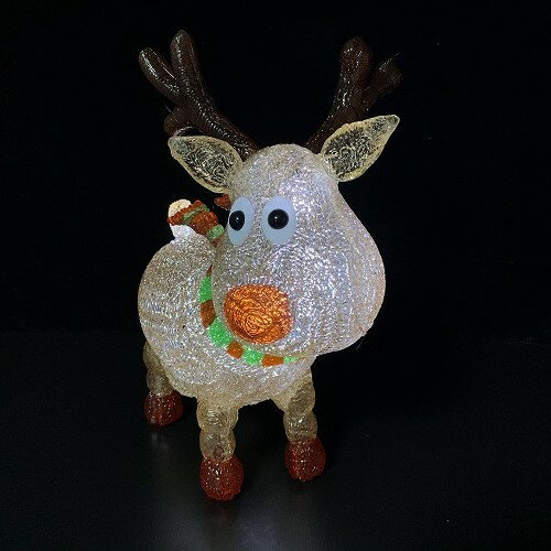 可愛い顔と愛嬌のあるスタイルが人気のトナカイ君。屋外仕様ですので玄関・ベランダ・お庭にも置いて頂けます。 さらに明るくなりました!お茶目なトナカイ君に待望の電源タイプが登場!! カウンターや階段にピッタリ!!置き場を選ばない可愛いサイズのイルミネーション。カラークリスタルモチーフですから点灯していない昼間でもオブジェとしてもお使い頂けます。 寸法:本体 高さ:32cm(角含む)、長さ:27cm、幅:12cm。 消費電力:2W。 組み立て不要・・・付属のコードを接続するだけ。電源:AC100V使用 PSE防水丸型12Vアダプター・電源コード約2m付。LEDホワイト。 常点。 消費電力:2W。 材質はプラスチッククリスタル。 転倒防止用ピン付き。 屋外/屋内使用可能(注)角部は点灯しません。 電気代の目安 消費電力2W 1日あたりの使用時間:(6時間仮定) 1日あたりの電気代:約0.5円 1ヶ月あたりの電気代:約15円 ※地域・契約により変わりますのでご了承願います。 (参考2022年電気代シュミレーター) クリスタルイルミネーションの特徴 ボディーのプラスチックを特殊加工することにより中のLEDの光源を斑なく全体に光を映し出します。 表面に空気を通る隙間があることによりブロータイプに比べて風の通りがよく風圧を軽減してくる為倒れにくいのが特徴。 LEDの幻想的な光がクリスタル全体的に映し出されご家族全員でお楽しみいただけるお勧めのイルミネーションです。 このクリスタルイルミネーションに可愛いカラーを施し夜はもちろん明るい昼間でも存在感を発揮。 点灯していない昼間でもオブジェとしてもお使い頂けます。 組立・使用等はいたって簡単 付属のコードを差し込み電源に差し込んで下さい。 後々のメンテナンスを考えたシンプル設計です。 ※附属のコードは約2mです。電源から設置場所までそれ以上の場合は市販の延長コードをご用意ください。 付属備品 PSE防水丸型12Vアダプター。電源コード 約2m。 転倒防止ピン付(土台に引っ掛けて土・芝生等に差し込んでお使いください。 新品でも破損・パーツチェックの為開封している場合がございます。ご了承願います。 梱包サイズ:40×27×40cm。 ☆雨天でもご使用いただけますが本体・パーツを水没するような場所には設置しないでください。激しい雨の日や暴風の日は屋内に保管していただくことをお勧めします。可愛さそのままにさらに明るくなりました!!待望の電源仕様登場!!