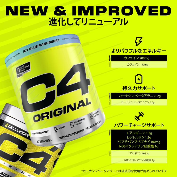 商品説明 ●初心者からアスリートまで、米国で大人気のプレワークサプリメント「C4」! ●パフォーマンス向上、爆発的なエネルギーを求める方へ ●カフェイン、アルギニン、ベータアラニン、クレアチンナイトレートなどトレーニングサポート成分を豊富に配合 <フレーバー全7種> ・アイシーブルーラズベリー ・フルーツパンチ ・サワーグリーンアップル ・ウォーターメロン ・グレープ ・オレンジ ・ピンクレモネード 消費期限・使用期限の確認はこちら 内容量 / 形状 30回分/50回分 パウダー ※製造工程などでアレルギー物質が混入してしまうことがあります。※詳しくはメーカーサイトをご覧ください。 ご使用の目安 食品としてトレーニングの20〜30分前に、付属スプーン1杯分を目安に、約180ml(6floz)のお水などによく混ぜてお召し上がりください。 ※ベータアラニンによってピリピリとした感覚が生じる場合がありますが、健康上の問題はございません。 メーカー Cellucor(セルコア) ・成人を対象とした商品です。 ・目安量を超えての摂取はお控えください。 ・8週間以上の継続使用はお控えください。 ・次に該当する方はご使用をお控えください。 - 妊娠・授乳中 - 胸の痛みのために硝酸塩を服用中 - PDE-5阻害剤などの勃起不全治療薬を服用中 ・次に該当する方は摂取前に医師にご相談ください。 - 栄養補助食品、処方箋薬、市販薬を服用中 - 医師による治療・投薬を受けている - 家族に病歴がある ・本製品にはカフェインが含まれています。 ・その他の栄養補助食品や医薬品など、他の原料から摂取するカフェインや刺激物との併用は避けてください。 ・手術の2週間前から中止してください。 ・本製品に何らかの副作用が生じた場合は、直ちに使用を中止し、医師にご相談ください。 ・高温多湿を避けて保管してください。 ・お子様の手の届かない場所で保管してください。 ・効能・効果の表記は薬機法により規制されています。 ・医薬品該当成分は一切含まれておりません。 ・メーカーの都合によりボトルデザイン、成分内容が予告無しに変更されることがあります。 Cellucor C4 Original Icy Blue Razz / Fruit Punch / Sour Green Apple / Watermelon / Grape / Orange / Pink Lemonade 生産国: アメリカ 区分: 食品 広告文責: ㈱ REAL MADE 050-3138-5220 配送元: CMG Premium Foods, Inc. せるこあ びたみん ないあしん かふぇいん しー4 シー4 fitness フィジーク ふぃっとねす トレーニング training diet とれーにんぐ きんとれ 筋トレ まっする マッスル 人気 にんき ランキング らんきんぐ ランキング上位 お勧め おすすめ