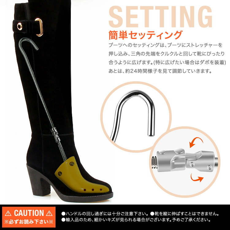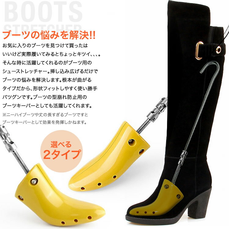 ブーツの幅や痛い部分を伸ばして悩みを解決する伸張器です。ブーツの型崩れ防止にも使えます。 先が曲がる構造になっているのでフィット感と使い勝手がバツグンです 左右どちらも使えるストレチャーになります。 特に、痛い、きつい部分には拡張パーツを使っていただくとより効果的です。 ストレッチャーを靴に挿入し、U字のハンドルを時計回りに回し靴にぴったりと合う状態にします。 そのままの状態で24時間ほど放置してください。 【ご購入前に必ずお読みください】 ※ハンドルの回し過ぎには十分ご注ください。 ※海外からの輸入品のため、細かいキズなどが見られる場合がございます。 ※全て使用には問題のない状態のため、上記に該当するお問合せにはご対応致しかねます。ご了承ください。 ※ニーハイブーツや長めのロングブーツでは効果を発揮しにくい可能性が御座います。 必ずサイズのご確認をお願い致します。 ※【このページは2個SETの販売ページになります。】※ プラスチック 外反母趾 幅広 ねじ式 革靴 ヒール メンズ レディース