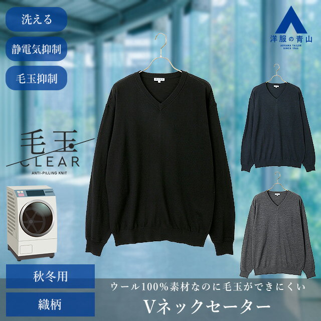 【洋服の青山】毛玉になりにくい ウール100% セーター メンズ Vネック 秋冬用 ブラック ネイビー グレー 洗える シワになりにくい 暖かい あったかい ウォッシャブル 静電気防止 形態安定 保温 トレーナー ビジネス ビジカジ カジュアル オフィス 大人 男性 おしゃれ xyz