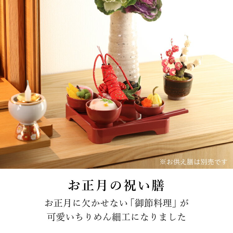 商品に関してやお困り事、ご相談などがございましたら、下記までお気軽にお問い合わせ下さい。現代仏壇 お客様相談室営業時間:平日 9:00-17:00(土日祝休) フリーダイヤル:0120-596-970メールでのお問い合わせは24時間受け付けております。 お問合せフォーム ご注文前にお読み下さいお供え膳は別売りです、 商品名ちりめん飾り 御節料理 商品説明ちりめん細工のおせち料理。ミニサイズの伊勢海老やかわいい梅花人参など、一年の幸福を祈る正月飾りです。イミテーションだから傷む心配がなく毎年飾れます。 お気に入りこの商品を保存する ブランド 現代仏具 シリーズ ちりめん飾り 生産国日本製 サイズ 主素材縮緬 組立状態完成品 梱包数1 梱包サイズ梱包1:幅27cm 奥行21cm 高さ12cm 配送方法宅配便 メーカー保証 備考 カテゴリちりめん飾り お盆・法事用品 その他の商品を見る 仏壇床に置く台付タイプ 仏壇壁に飾る壁掛けタイプ 仏壇家具や棚、台の上に置くタイプ 仏壇コンパクトタイプ 位牌 写真立て・フォトフレーム おりん・りん棒・おりん台 過去帳・過去帳台 香炉(線香立て)・線香差し 線香・ローソク・お手入れ用品 五具足セット・具足単品・神具 数珠・念珠ちりめん細工のおせち料理。ミニ伊勢海老やかわいい梅花人参など、御節料理をご先祖さまにお供えできます。イミテーションだから傷む心配がなく毎年飾れます。京都の職人が手作りした日本製だから安心の品質。お供え膳は別途承ります。送料無料「ちりめん飾り 御節料理」現代仏壇