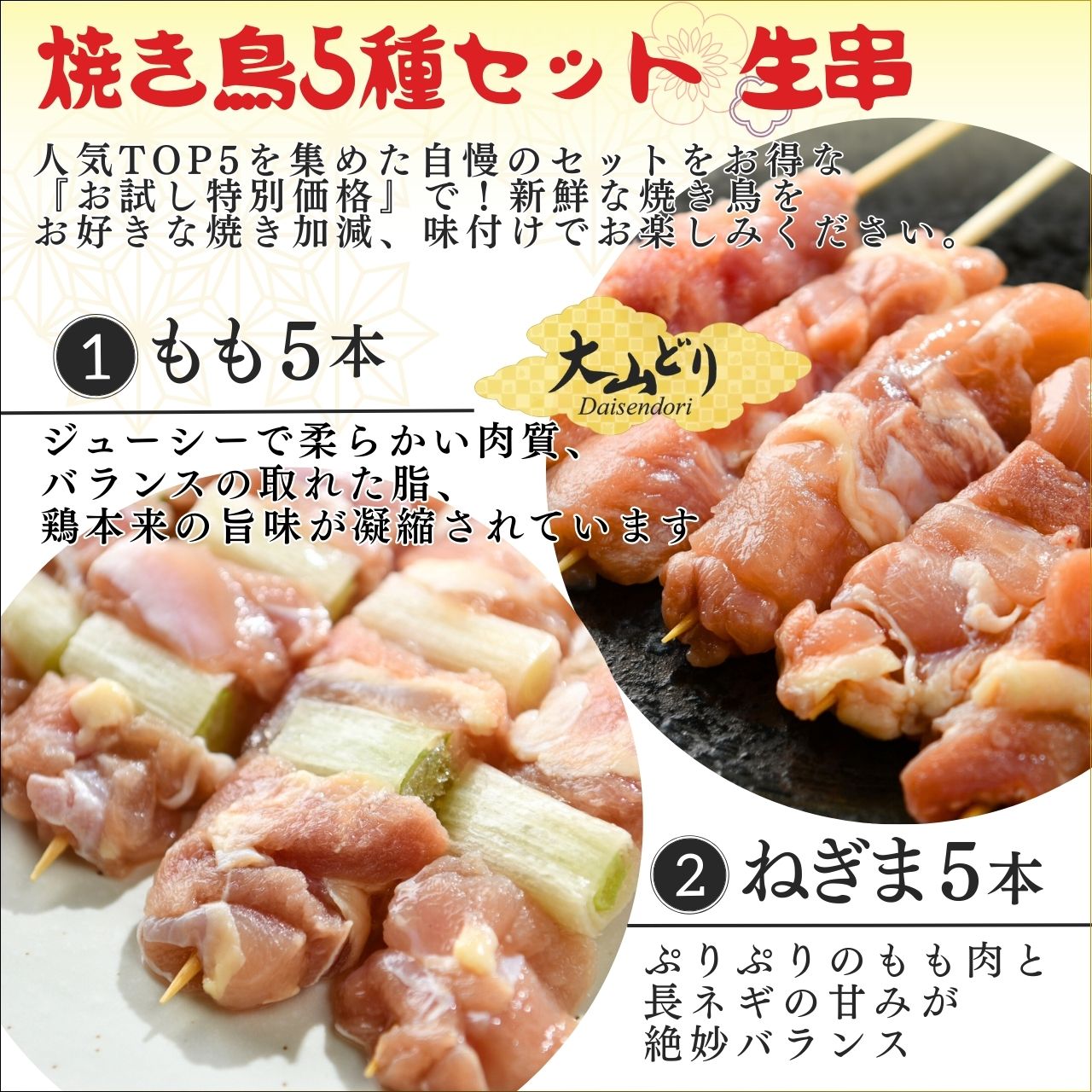 内容量 ・鳥取県産大山どり もも串【生】 40g×5本 ・鳥取県産大山どり ねぎま串【生】 40g×5本 ・国産 つくね串【生】 40g×5本 ・国産 かわ串【生】 40g×5本 ・鳥取県産 レバー串【生】 40g×5本 ・《自家製》 こだわりの焼き鳥塩 20g×2本 ・《自家製》 こだわりの焼き鳥タレ 40g×2本 賞味期限 ・製造日から30日間 調理方法 ・塩の場合……串の肉の部分の両面に酒と塩をふり、グリル・フライパンで片面5分ずつ焼いてください。最後に再度お好みで塩をふってください。 ・タレの場合……串の肉の部分の両面に酒と塩をふり、全体にタレにくぐらせます。グリル・フライパンで2~3分ほど両面を焼いたら、もう一度タレにくぐらせ、さらに片面3分ずつ焼いてください。最後に再度お好みでタレにくぐらせてください。 保存方法 冷凍庫で保存 原材料 鶏肉 製造者 有限会社 フリーダム 鳥取県鳥取市富安1-40特製ダレと塩付きでご自宅で本格焼き鳥をお楽しみいただけます!