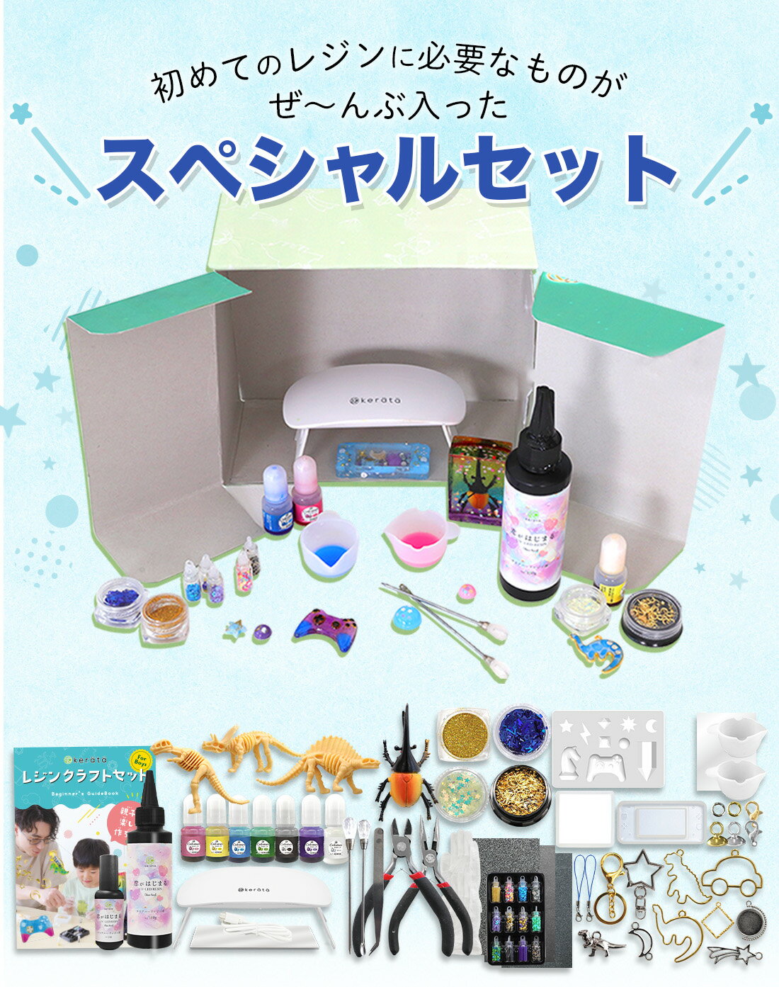 【シリーズ累計販売数100,000個突破!】 ケラッタのレジンクラフトシリーズに 男の子向けのレジンセットがついに登場! 「何から揃えていいかわからない・・・」「お店を回るのは大変・・・」 「かっこいいパーツがなかなか見つからない」 ケラッタのレジンセットは必要な道具が全部そろって、 わかりやすいガイドブック付きなので初めてでも安心♪ 楽しくレジンデビューができるよう、 男の子が好きな恐竜や昆虫、ゲームなどのパーツをたくさん集めました! 自分だけのオリジナル作品を作ろう♪ ※セット内容に含まれるすべての道具や パーツ素材類の仕様や内容量などについては、 入荷の時期により変更になる場合があります。