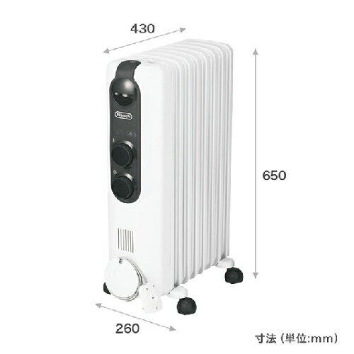 デロンギ RHJ35M0812-DG アミカルド オイルヒーター 1200W 8〜10畳 ピュアホワイト+ブラック ●最適な消費電力を自動で設定温度を設定するだけで、最適な消費電力で運転するので設定ラクラク。●デジタル式ON/OFFタイマー〇〇時間後にONまたはOFFにすることができる簡単操作のタイマー。10時間先までは30分単位で、10時間〜24時間後までは1時間単位で設定可能。●高い安全性フィンの表面積を従来型フィン比1.4倍に広げた「新L字型フラットフィン」を採用。平均表面温度約70℃を実現。表面の温度が高くなりすぎない安心設計。一瞬触れただけではやけどの心配が少なく、火事の心配もないので赤ちゃんやお子様にも安心。●家計にやさしい、約20%節電できるECOモード搭載。「ECOボタン」を押すだけで、簡単に約20%の節電が出来るECOモード。部屋の温度を感知して、最適な電力レベルで、設定した温度よりも少しだけ控えめに賢く運転するお役立ち機能で、家計にも優しい。●誤操作防止用のチャイルドロックを搭載●風が出なくても部屋全体が暖かいデロンギヒーターは輻射熱(太陽が地球に熱を伝える方式)と自然対流(暖かい物体の周辺空気が上昇気流で自然に上に上がっていく方式)を使って部屋全体を暖めます。●肌も喉も乾燥しにくい温風を出さないから水分を奪われることがほとんどなく、肌やのどにやさしい。●空気を汚さず清潔温風を出さないので、室内のホコリやハウスダスト、ペットの体毛などを巻き上げることがありません。発火、燃焼もないため、空気を汚しません。●燃料の補充が不要、お手入れも簡単金属製の本体が密閉された難燃性オイルによってあたためられ、部屋全体に熱を伝えます。 【仕様】本体サイズ(高さ×幅×奥行):430×650×260 mm質量 :12.5kg消費電力 :1200Wコード長:2.3m広さの目安:〜10畳