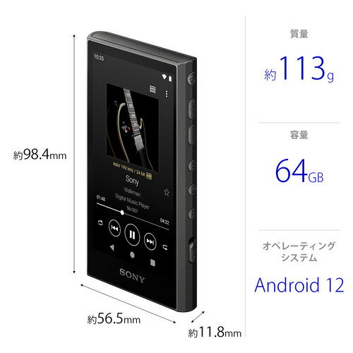 ソニー NW-A307 B ウォークマン ハイレゾ音源対応 WALKMAN A300シリーズ 64GB ブラック発売日:2023年1月27日●「音楽専用機」だけの、沼音の世界へ。スタミナも進化したストリーミングWALKMAN●あらゆる音源を有線でも、ワイヤレスでも、高音質で楽しめるCD音源やダウンロード購入した楽曲、ストリーミングサービスで配信されている楽曲などあらゆる音源を「音楽専用機」ならではの高音質で再生。●広がりや透明感のある音質を実現ハイレゾ対応オーディオプレーヤーとして音質を徹底的に追求。基板やはんだ、本体フレームなどに選び抜いたパーツを多数採用し、最適にレイアウトすることであらゆる音源を音楽専用機ならではの豊かな音場、解像度の高い高音質でお楽しみいただけます。●最大約36時間再生可能なロングバッテリー。ストリーミングサービス利用時のバッテリー持続時間も向上。新規プラットフォーム採用により、省電力化を実現し、特に待機時の消費電力や、音楽ストリーミングサービス使用時等の電力消費量を大きく削減しています。 MP3 128kbpsモード、有線接続かつ画面オフの状態で「W.ミュージック」で連続再生時。設定条件により異なります。アプリの使用状況によっては短くなることがあります。動画再生時は電池持続時間が短くなります。 当社従来品NW-A100シリーズ比●PCレス楽曲転送 -かんたん便利にウォークマン(R)で楽曲を楽しめるストリーミングサービスの音源やCDやダウンロード購入した楽曲をかんたん便利にストリーミングWALKMAN(R)でお楽しみいただけます。あらゆる転送方法に対応し、パソコンを使っても使わなくても楽曲の取り込みが可能です。●ワイヤレスでもハイレゾ音質/ハイレゾ級高音質を楽しめるBluetooth(R)のワイヤレス音楽再生時もハイレゾコンテンツをハイレゾ音質で楽しめる「LDAC(TM)」に対応。さらに、音源をハイレゾ級にアップスケーリングするDSEE Ultimateがワイヤレス接続時にも対応し、圧縮音源もハイレゾ級高音質で楽しむことができます。 LDACは日本オーディオ協会の“Hi-Res Audio Wireless”に認定されたコーデック技術です。ハイレゾコンテンツを転送速度990kbpsで伝送する場合。 有線接続・無線接続ともに「DSEE Ultimate」ON時(最大 192kHz/32bitまで拡張)LDAコーデックで無線(Bluetooth(R))接続する場合、最大 96kHz/24bitで再生可能。●快適な操作性を実現するAndroid(TM)12.0使いやすいUI、タッチ機能などの快適な操作性、そしてGoogle Play(TM)ストアからの豊富なアプリのダウンロードなど、さまざまなシーンで多彩に楽しめます。 【仕様】容量:64GB※ 実使用可能領域は約47GB※ ソフトウェアアップデートの際は、内部共有ストレージの空き容量が3.5GB程度必要ですオペレーティングシステム:Android 12※ 本製品の一部機能を使うには、Wi-Fi環境が必要です対応フォーマット: ・MP3( .mp3):32 - 320kbps (VBR対応)/ 32、 44.1、 48kHz ・WMA( .wma):32 - 192kbps (VBR対応)/ 44.1kHz ・FLAC( .flac):16、 24bit / 8-384kHz ・WAV( .wav):16、 24、 32bit (Float/Integer)/ 8-384kHz ・AAC( .mp4、 .m4a、 .3gp):16-320kbps / 8-48kHz ・HE-AAC( .mp4、 .m4a、 .3gp):32-144kbps / 8-48kHz ・Apple Lossless( .mp4、 .m4a):16、 24bit / 8-384kHz ・AIFF( .aif、 .aiff、 .afc、 .aifc):16、 24、 32bit/ 8-384kHz ・DSD( .dsf、 .dff):1bit / 2.8224、 5.6448、 11.2896 MHz ・APE( .ape):8、 16、 24bit / 8-192kHz(Fast、 Normal、 High) ・MQA( .mqa、 .flac):対応 ディスプレイ:3.6型(9.1 cm)、HD(1280×720ドット)タッチパネル:●ワイヤレスLAN: ・規格:IEEE 802.11 a/b/g/ac ・使用周波数帯域:2.4/5 GHz 帯 ・暗号化:WEP/WPA/WPA2Bluetooth機能: ・通信方式 : Bluetooth標準規格 Ver 5.0 ・使用周波数帯域 : 2.4 GHz帯(2.4000 GHz - 2.4835 GHz) ・変調方式 : FHSS ・対応Bluetoothプロファイル - A2DP(Advanced Audio Distribution Profile) - AVRCP(Audio Video Remote Control Profile) -SPP(Serial Port Profile) -OPP(Object Push Profile) -DID ・対応コーデック (送信): SBC 、 AAC、 LDAC、 aptX、 aptX HDUSB DAC機能:●対応アプリケーションソフトウェア:・Music Center for PC 対応OSはサポートページからご確認下さい。・Macで操作するには、別途ソフトウェアが必要です。USB充電 充電時間:約3.5時間(満充電)、約3時間(約80%まで充電)充電池持続時間:【音楽再生時(W.ミュージック)】●MP3 128kbps 約36時間●FLAC 96kHz/24bit 約32時間●FLAC 192kHz/24bit 約32時間●DSD 2.8224MHz/1bit 約28時間●DSD 5.6448MHz/1bit 約22時間●DSD 11.2896MHz/1bit 約14時間【音楽再生時(W.ミュージック以外の音楽サービスアプリ)】●MP3 128kbps (オフラインモード) 約26時間【Bluetooth再生時(送信モード)(W.ミュージック)】●SBC(接続優先) / MP3 128kbps約21時間●LDAC(接続優先(自動)) / FLAC 96kHz/24bit約11時間【Bluetooth再生時(送信モード)(W.ミュージック以外の音楽サービスアプリ)】●LDAC(接続優先(自動)) / MP3 128kbps約18時間ヘッドホン実用最大出力(JEITA 16Ω/mW):35mW+35mWパソコンとの接続/本体端子の形状:Type-CmicroSDメモリーカード:microSD、microSDHC、microSDXC外形寸法(幅×高さ×奥行/mm)*最大突起部含まない寸法:約56.5 mm x 98.4 mm x 11.8 mm質量 充電池含む(g):約113g最大記録曲数(音楽):●MP3 128kbps 約12、000曲●AAC 256kbps 約6、400曲●FLAC 44.1kHz/16bit 