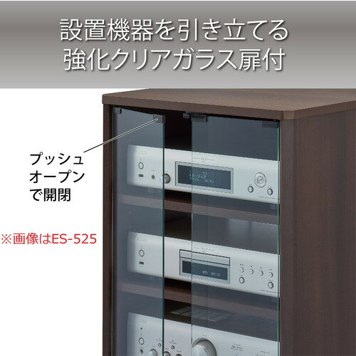 ハヤミ工産 ES-525 オーディオラック HAMILeX ダークブラウン ES525発売日:2022年5月11日●コンパクトエントリーモデルのオーディオラック。ダークブラウン木目とクリアーガラスの組み合わせ。●天板の仕様。スッキリとした印象の厚さ18mmの天板。●表面材。質感の高いダークブラウン木目は耐久性に優れたPVCシート仕上げ。●放熱性を考慮した背面。ラック内部の放熱を考慮し、背面は一部開口した仕様。●移動に便利なキャスター。利便性に優れたキャスターを標準装備。※前方2カ所はストッパー付。 【仕様】外形寸法:幅 520 × 奥行き 470 × 高さ 900 (mm)質量:約28kg総耐荷重:80kg付属品:棚板3枚天板 耐荷重:20kg以下棚板 耐荷重:15kg以下底板 耐荷重:50kg以下
