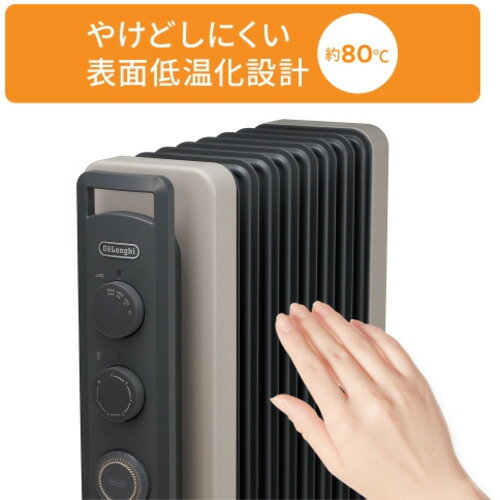 デロンギ RHJ21F0812-GY オイルヒーター デロンギヴェルティカルド 1200W シダーグレー(ダークグレー+グレージュ) ●約80℃、やけどしにくい安全設計フィンにあけられた15ヶ所の穴によって外周部への熱伝導を抑制する。「サーマルカットフィン」で、平均表面温度約80℃を実現。さらに、エッジを巻き込んだ形にすることで安全性を高めています。●24時間思いのままに。便利なタイマー設定生活スタイルに合わせて使用できる24時間ON/OFFタイマーを採用。24時間ご希望の時間に、暖房運転の開始(オン)と停止(オフ)を何度でも設定が可能です。●適温を保つサーモスタット(温度設定ダイヤル)電源のオン/オフを自動的に繰り返してお好みの室温を一定に保ちます。適温になったらサーモスタットを回して電源ランプが消えるポイントまで戻します。●運転切り替えダイヤル運転開始、停止の切り替えと電力レベル(暖房の強さ)を設定できます。お部屋の広さなど、ご希望に合わせて消費電力を3段階(500W、700W、1200W)で調整可能です。●スタイリッシュなイタリアンデザイン正面の操作部をフラットなパネルにすることで、全体のデザインに縦ラインの視覚的リズムを生み出しました。ニュートラルカラー2色を配色しリズム感を強調。さらにマット加工で仕上げ、モダンなインテリアとの融合を図りました。●人間工学に基づいた使いやすいデザインケーブルホルダーを操作パネルと一体化し、縦長にすることで、従来より巻く手間を軽減。つかみやすく操作しやすいダイヤル式ユーザーインターフェイスや握りやすいハンドルなど従来モデルに比べて操作性を向上しました。●風が出なくても部屋全体が暖かいデロンギヒーターは輻射熱(太陽が地球に熱を伝える方式)と自然対流(暖かい物体の周辺空気が上昇気流で自然に上に上がっていく方式)を使って部屋全体を暖めます。●肌も喉も乾燥しにくい温風を出さないから水分を奪われることがほとんどなく、肌やのどにやさしい。●空気を汚さず清潔温風を出さないので、室内のホコリやハウスダスト、ペットの体毛などを巻き上げることがありません。発火、燃焼もないため、空気を汚しません。●燃料の補充が不要、お手入れも簡単金属製の本体が密閉された難燃性オイルによってあたためられ、部屋全体に熱を伝えます。 【仕様】本体サイズ(高さ×幅×奥行):520×650×260 mm質量 :13.0kg消費電力 :1200Wコード長:2.3m広さの目安:〜10畳
