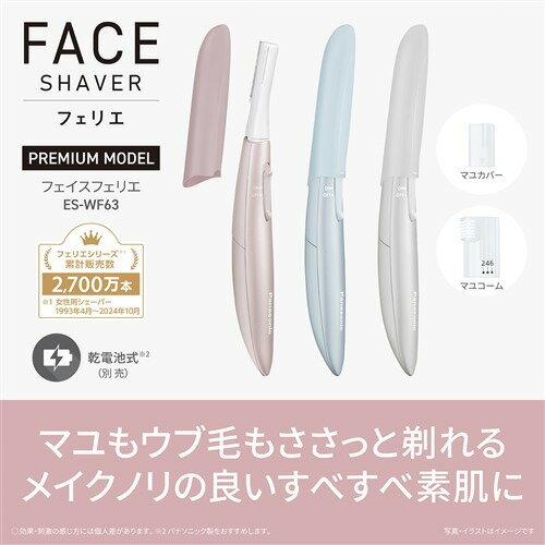 パナソニック ES-WF63-H フェイスフェリエ 顔用ウブ毛ケア グレー発売日:2025年5月1日●肌にやさしくささっと剃れる。マユケアまでできるプレミアムモデル。●丸い刃先で肌にやさしい、約0.12mmのうす刃。水なしですっきり剃れる。●肌の凸凹に合わせて動く、密着スイングヘッド。●マユのお手入れができる。マユカバーとマユコーム付き。 【仕様】本体寸法:高さ15.6×幅1.7×奥行3.0cm(キャップ装着時)本体質量:約20g(乾電池除く、キャップ含む)電源方式:乾電池式電源・電圧:DC1.5V(単4形アルカリ乾電池(※パナソニック製をおすすめします。※)または単4形充電式電池(※パナソニック製をおすすめします。※)×1本)電池寿命:週2回(1回約5分間)の使用で約1カ月間使用可能(室温20度の時)(※パナソニック製アルカリ乾電池を使用した場合※)用途:●ウブ毛用 ●マユメイク機能:●密着スイングヘッド ●マユカバー ●マユコーム ※水洗いできません付属品名称:掃除用ブラシ、マユカバー、マユコーム