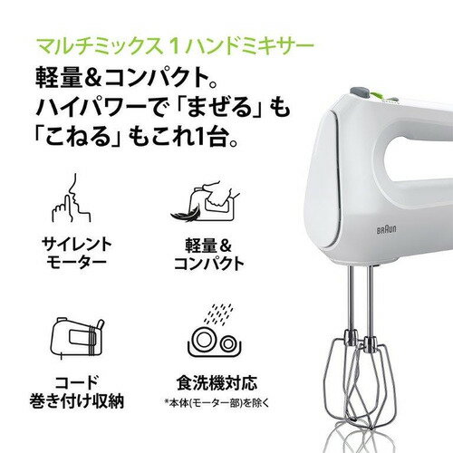ブラウン HM1011 マルチミックス1 ハンドミキサー ホワイト発売日:2024年10月17日●150Wのハイパワー150Wのハイパワーで、素早く簡単にお菓子作りが可能。●4段階スピード+ターボ機能4段階のスピードで正確に攪拌。ターボ機能も搭載。●オールステンレスのビーター&ニーダーの付属品ビーターで「混ぜる」、ニーダーで「こねる」が可能。ビーターは生クリームや卵白、ニーダーはパン生地やパスタ生地などのレシピに。ツールはボタンをワンタッチするだけの簡単操作で交換可能。●サイレントモーター操作音を抑えるサイレントモーター採用。●軽量&コンパクトボディパワフルながら、軽量&コンパクトなボディで操作し易い。●扱いやすいハンドル設計手の小さな人でも大きな人でも握りやすい形状のハンドル。●コンパクト収納コードは本体に巻き付けてスッキリと一体化。付属のコットンポーチに入れ、コンパクトに収納可能。 【仕様】本体サイズ(幅×奥行×高さ):210×75×152 mm本体重量:825gコード長:1.5m電圧・周波数:AC 100V 50-60Hz消費電力:150W回転数:970回 ※無負荷時定格時間:ビーター使用時:15分定格時間:ニーダー使用時:10分
