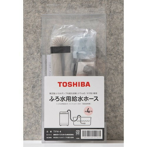 東芝 TFH-4 ふろ水給水ホース 東芝洗濯機用 フィルター付き 抗菌加工 4m発売日:2025年4月下旬●東芝洗濯機に対応したふろ水ホースお風呂の残り湯を使用して洗濯することで、水道水の使用量を削減します。※ふろ水ポンプ機能付きの東芝製洗濯機専用 【仕様】長さ:4m ※お届け時は、じゃばら状のホース部分は縮められて入っております。じゃばらを伸ばした状態が商品の長さとなります。