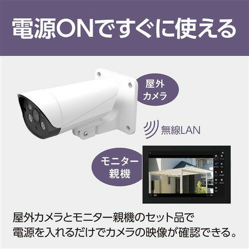 パナソニック VL-CV100K モニター付き屋外カメラ 400万画素 IP54防水防塵対応 ホワイト発売日:2025年1月10日●電源ONですぐに使える モニター付き屋外カメラ●電源ONですぐに使える。屋外カメラと親機のセット品で電源を入れるだけでカメラの映像が確認できる●動きや人物を検知して自動録画(※映像はmicroSDカード(別売)へ録画されます。※)通話機能で威嚇(声かけ)ができます。●中継器を追加して通信可能な距離を拡大できる。最大2台まで追加可能。 【仕様】本体寸法:カメラ:幅108mm×高さ108mm×奥行195mm モニター親機:幅198mm×高さ131mm×奥行25.5mm ※突起部除く本体質量:カメラ:約620 g モニター親機:約450 g品番:カメラ:VL-FKC100K モニター親機:VL-CVM100電源:ACアダプター(品番: SSW-3533-1) AC100V (50Hz / 60Hz) DC12V/1.2A消費電力:カメラ:LEDライト消灯時 約3W、LEDライト点灯時 約7W モニター親機:待機時 約2.4W、動作時 約6.5W使用環境条件:カメラ:(周囲温度)-10 度〜+50 度、(湿度)20%〜90 %(結露なきこと) モニター親機:(周囲温度) 0度〜+40度、(湿度)90%以下外観材質:カメラ:ABS樹脂、アルミダイキャスト、ガラス モニター親機:ABS樹脂、ガラス無線通信方式:カメラ:無線LAN (2.4GHz) 規格:IEEE802.11b/g 暗号化方式:WPA2-PSK(AES) 伝送速度(最大):72.2 Mbps モニター親機:無線LAN(2.4GHz)、アクセスポイントモードコード長さ:ACアダプターコード:約1.8m DCコード:約5.0mモニター機 画面:■画面表示 約8型 カラー液晶ディスプレイ ■画面サイズ(縦×横) 約108 x 173mm ■画素数 WXGA (1280 x 800)モニター機 スペック:■通話方式 双方向通話方式(プレストーク方式) ■録画容量 microSDカード最大128GB (録画時間最大約580時間(解像度:SD)※)(※:microSDカードが128 GB分のとき) ■記録方式 動画情報 MP4 (動画部分:H.264、音声部分:AAC) ■カメラ接続可能台数 最大4台(※セット品含む)屋外カメラ:■使用可能距離 約100 m(障害物無し) ■撮像素子 400万画素高感度CMOSセンサー ■出力映像 SD/HD/FHD ■解像度 最大 1920×1080 ■フォーカス範囲 固定(約1m〜∞) ■撮影範囲(カメラ画角) 水平 約75°垂直 約40°屋外カメラ 検知:■検知方式 人検知および動作検知(画像による検知) ■動作検知範囲 水平 約75°垂直 約40°屋外カメラ ライト:■白色LEDライト 白色LED4個 ■赤外線LED 赤外線LED4個屋外カメラ ナイトビジョン:あり(スマートモード / 赤外線モード / カラーモード) (※スマートモード:赤外線モードから人検知後、カラーモードへ遷移) 〇ナイトビジョン距離 約10m(※夜間(暗い場合)に[ナイトビジョンモード]の設定で、赤外線LEDまたは白色LEDが点灯した場合の撮影可能な距離)屋外カメラ 防塵・防水性:防塵・防水性 IP54(※防塵性規格等級5:機器の所定動作および安全性を阻害する塵埃は入らないレベル ・防水性規格等級4:あらゆる方向からの飛まつによる水によっても有害な影響を及ぼさないレベル(ACアダプターに防水性能はありません)。) 屋外カメラ 取付角度調整(取り付け時に設定可):水平 ±約90°、垂直 正面〜下方向へ約60°取り付け時に設定可
