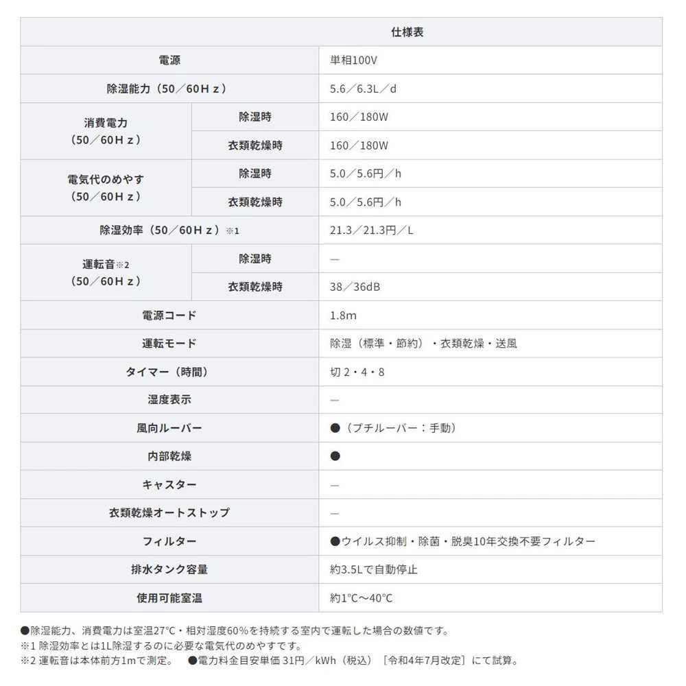 ※リニューアル等にともないパッケージや仕様が変更となる場合がございます。商品情報商品名衣類乾燥除湿機 Pシリーズ コンプレッサー式 [家電 木造7〜鉄筋14畳 プレハブ11畳 除湿6.3L]メーカーCORONA(コロナ) 規格/品番 CD-P6325(W) ホワイト サイズ ●サイズ(約):幅220×奥行330×高さ515mm 重量/容量 ●重量:約7.9kg●タンク容量:3.5L おすすめ ●コンプレッサー式衣類乾燥除湿機●コンプレッサー式だから部屋干しも除湿もお得で快適●選べる除湿モード(標準・節約)●3.5Lのビッグタンク●コンパクトでもしっかり除湿●汚れがつきにくく落ちやすい抗菌・防カビ仕様の熱交換器●プチルーバー(手動)●ウイルス抑制・抗菌・脱臭の10年交換不要フィルター●内部乾燥モード●満水メロディー●3色に光るお知らせサイン●日本製 仕様 ■除湿可能面積のめやす:50Hz:プレハブおもに11畳、木造7〜鉄筋14畳60Hz:プレハブおもに12畳、木造8〜鉄筋16畳●電源:単相100V●除湿能力(50/60Hz):5.6/6.3L/日■消費電力(50/60Hz):●除湿時:160/180W●衣類乾燥時:160/180W■電気代のめやす(50/60Hz):●除湿時:5.0/5.6円/h●衣類乾燥時:5.0/5.6円/h●除湿効率:21.3/21.3円/L※ 除湿効率とは1L除湿するのに必要な電気代のめやすです。※電力料金目安単価 31円/kWh(税込)[令和4年7月改定]にて試算。●運転音(50/60Hz):衣類乾燥時:38/36dB●電源コード:1.8m●運転モード:除湿(標準・節約)・衣類乾燥・送風●タイマー(時間):切 2・4・8●風向ルーバー:プチルーバー:手動●内部乾燥●フィルター:ウイルス抑制・除菌・脱臭10年交換不要フィルター●排水タンク容量:約3.5Lで自動停止●使用可能室温:約1℃〜40℃ 梱包サイズ