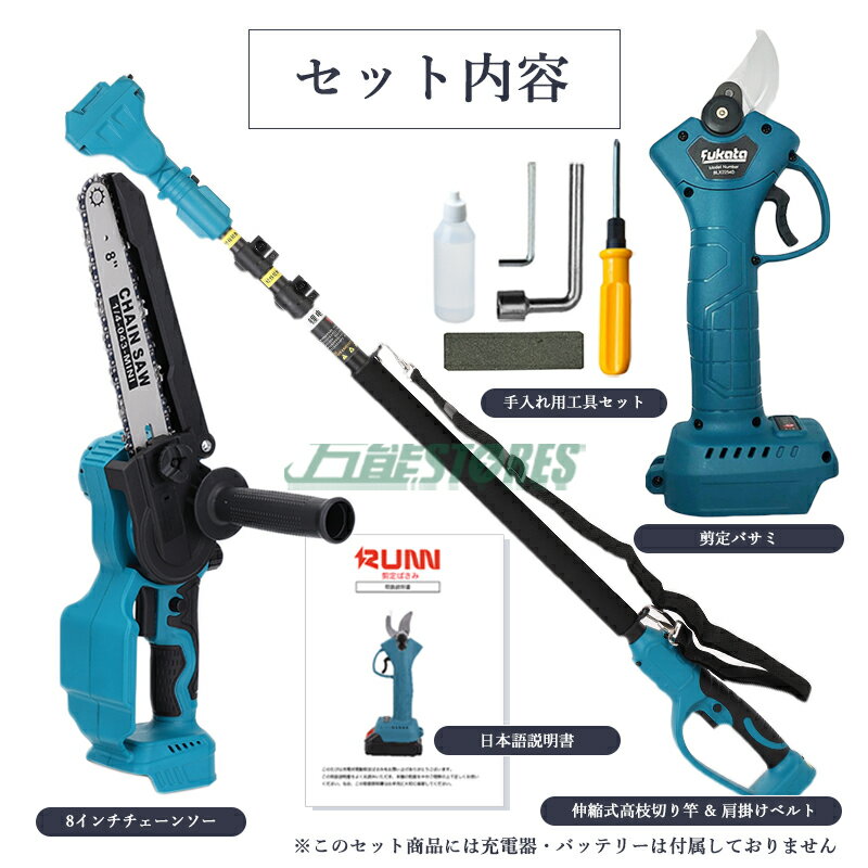 届出事業者名:桜本株式会社 PSマークの種類:PSE 【商品詳細】 【商品名】高枝切り竿・チェーンソー・剪定バサミの3点セット 【セット内容】 Polepruner 高枝切り竿(肩掛けベルト付き) BLX18153P 8インチハンディーチェーンソー RDJ500 剪定バサミ 手入れ用工具セット(5点) 日本語取扱説明書 【剪定バサミ】 定格電圧18V/21V 最大パワー500W 最大剪定幅25mm 特徴 30mm以内の木材も切断可能なブラシレスモーター採用。 滑り止め付きのハンドルで長時間作業も快適。 ナイフサイズは4モード(10mm、15mm、20mm、30mm)切替可能。 ※モード切替時は電源ボタンのみを押してください。 【ハンディーチェーンソー(8インチ)】 定格電圧18V/21V 最大パワー550W 回転速度2703(R/MIN) 特徴 最大切断幅:200mm 高出力純銅モーター搭載で高効率・耐久性に優れます。 20cmの木材を約15秒で切断可能。 焼入れ加工の刃で高硬度・耐摩耗性も抜群。 重さ1.4kgで軽量、片手でも操作可能。 【高枝切り竿】 定格電圧18V/21V 伸縮幅125cm〜250cm(無段階調節) 特徴 チェーンソーまたは剪定バサミを装着可能な多機能ポール。 ポールを外してハンドツールとしても使用可能。 最大250cmの長さで高所作業も効率的。 ヘッド角度調整でより快適な作業環境を実現。 【用途】 公園・果樹園・庭園・牧草地・観葉植物・農場などで、果樹や花、つる植物の剪定に最適。 緑化作業、枝竹切断、DIY木工、家庭用など幅広いシーンで活躍します。 【保証について】 ●保証期間:12ヶ月 ●初期不良(購入後3ヶ月以内)の場合は代替品を提供 ●在庫状況により返金対応となる場合もあります ●水没・破損・加工・分解・過度使用は保証対象外 ●必要に応じてメーカー内部調査を行う場合あり 【配達不可による返送品】 ●[長期不在]・[受取拒否]・[住所不備]などによる返送時は、往復送料をご負担いただきます。 ●再配達時やキャンセル時も、送料を差し引いた金額での対応となります。 (キャンセル処理ではなく金額訂正処理になります。ご了承ください。)