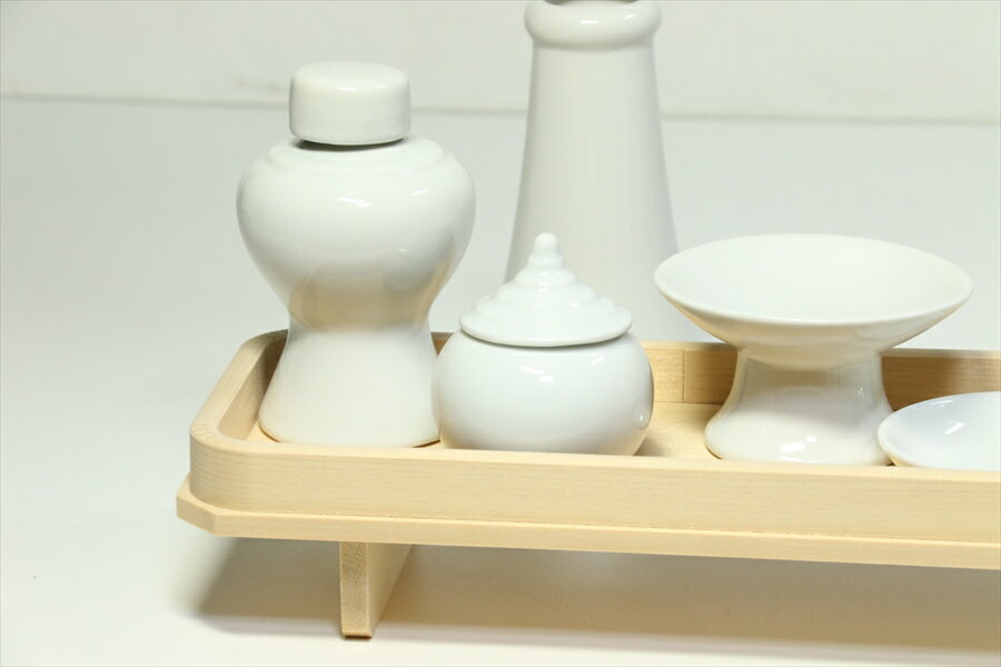 商品詳細 木曽ひのき製の長膳になめらかな質感と光沢、国産「せともの」陶器製の白無地の神具セット。お祀りに必要な榊立、平次、水玉、そしてお米はお皿ではなく、ワンランク上の高杯にて神様にお供えしましょう。中・大型(横幅90cm程度まで)の神棚に最適なサイズとなっています。 セット内容約(cm) ・長膳(木曽ひのき材) 1尺(高さ5.5 幅30 奥行10) ・高杯 2.5寸(高さ4 径8.5)×1 ・榊立 4寸(高さ12.3 幅6.5)×2 ・瓶子 3寸(高さ10 幅6.2)×2 ・水玉 2寸(高さ6.5 幅5.5)×1 ・皿 2.5寸(高さ1.8 幅7.9)×1 送料 「送料ご案内ページ」をクリックしてご確認ください。