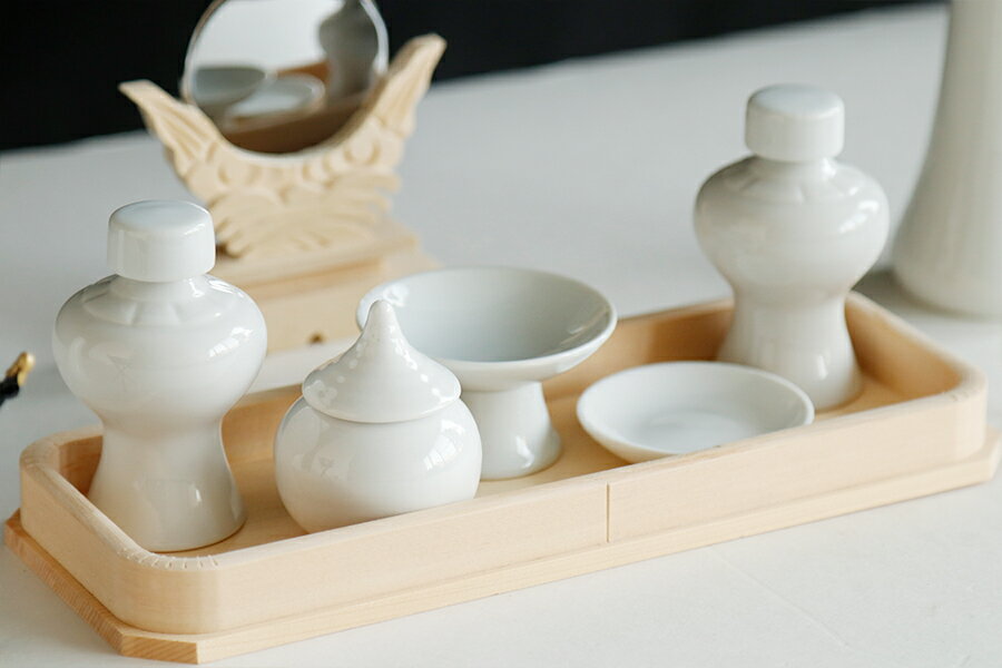 木曽ひのき製 長折敷になめらかな質感と光沢、国産「せともの」陶器製の白無地の神具セット。 お祀りに必要な神鏡、かがり火、シルク調造花榊、榊立、平次、水玉、そしてお米はお皿ではなく、ワンランク上の高杯にて神様にお供えしましょう。 小・中型(横幅65cm程度まで)の神棚に最適なサイズとなっています。 様々なセットがございます。以下から各商品ページに移行できます。 神具セット13品目高坏付一覧 --- ■神鏡 2寸 高さ11.5 幅8.5 奥行2.5 ■かがり火 2.5寸 高さ7.5 ■シルク調造花榊1対 高さ35 幅20 ■長折敷 8寸 (木曽ひのき材) 高さ2.5 幅24.5 奥行9.5 ■国産神具セット(白無地) 中 ・高杯 2寸(高さ3.5 径6.5)×1 ・榊立 3.5寸(高さ11 幅6)×2 ・瓶子 2.5寸(高さ8.5 幅5.5)×2 ・水玉 1.8寸(高さ6 幅5.5)×1 ・皿 2寸(高さ1.5 幅6.5)×1 「送料ご案内ページ」をクリックしてご確認ください。