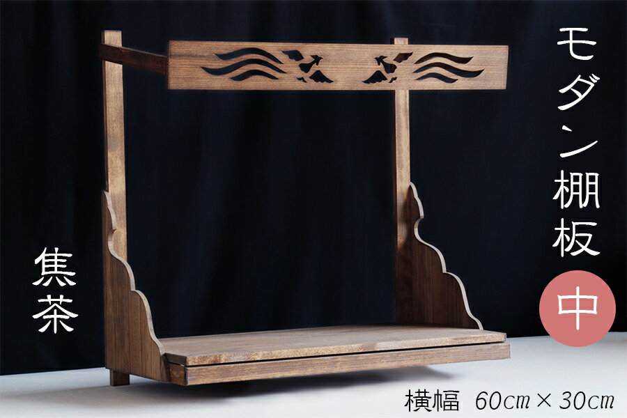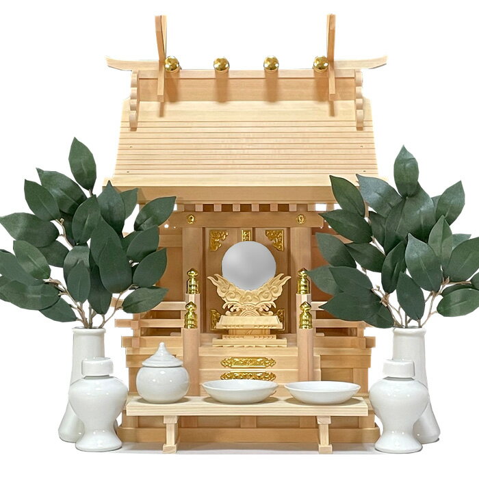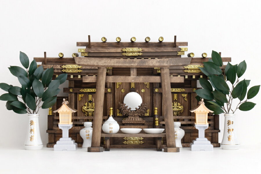 当店で大好評を頂いております「寿福宮」。煌びやかなお社に、さらに濃い褐色で仕上げた家具調・モダン神棚、限定数販売となっています。 使用している塗料は100%天然素材、亜麻仁油に由来する成分からなり家具用としても使われる高級塗料です。職人が調色・配合し手塗りで作業。東濃桧の美しい木目のを引き立てています。 サイズは横幅が65cmとやや大き目ながら、高さを抑えた低床形、さらに奥行きは20cmと大変薄くなっています。圧迫感を抑え、お部屋にモダンな感覚でお祀りしたい方にも人気です。お神札は底面から挿入して簡単に納められる、スライド式収納の便利設計です。 付属の神具も家具調色に染めた神鏡、八足台と明神鳥居。陶器類は国産「せともの」に金文字をあしらった美しい、「ご神前」神具セットです。 さらに当店で大変ご好評をいただいております、リモコンで点灯・消灯ができるLED 神前灯篭「ゆらぎ」が付属いたします。炎は本物の様にゆらめいて灯り、神棚を照らし出します。 寿福宮には神具違い、モダンカラーなど様々な種類がございます。下記リンクからご覧頂けます。 寿福宮 シリーズ一覧 ・金文字神具7点セット 中(榊立てx2、平次x2、水玉、皿x2) ・上彫り神鏡 2寸 ・LED灯篭 5号(リモコン付) ・明神鳥居 ・八足台 ・造花榊 神棚の大きさ 高さ36 幅65 奥行き20 お神札が入るスペース 中央:高さ26 幅14 奥行き6 左右:高さ21 幅11 奥行き6 ご注文が重なった場合、塗装・乾燥作業のため2〜3週間お待ちいただいてしまう場合がございます。その場合は当店からご連絡を差し上げると共に、ご自由にご注文のキャンセルが可能です。 職人手作りの品のためすべての商品が完全に同じではなく、ヤニ、小傷等出ることがあります。ご了承ください。 「送料ご案内ページ」をクリックしてご確認ください。■その他の三社セットはこちら
