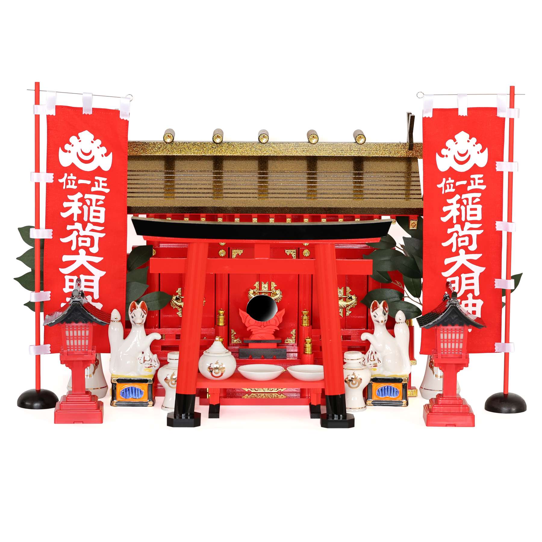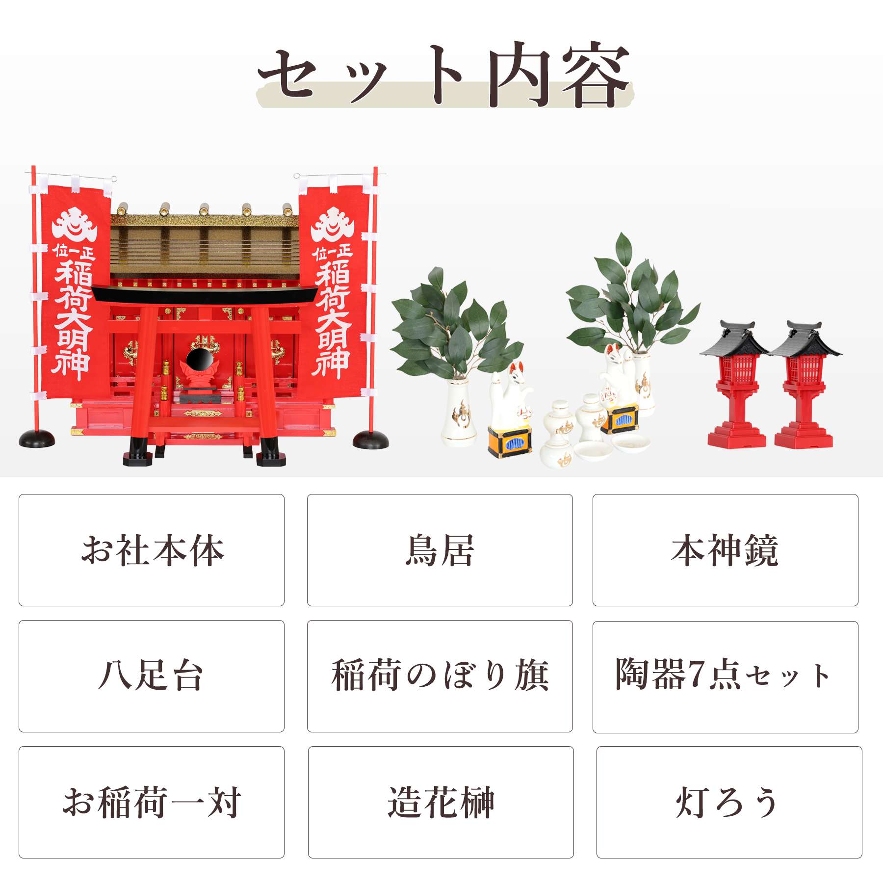 商品詳細 輝く黄金の屋根をしつらえた稲荷宮 贅沢な稲荷宮一式セットの神棚 光の当たる角度で様々な「金」を放つ、美しく神々し神社です。丹念な重ね塗りは、艶のある光沢の仕上がりに。 お社本殿は岐阜県産の高級材「東濃桧」 工房の職人がゆっくりと丁寧に組み上げた「通し屋根三社」の造り。3枚のお神札をお納めできます。お供え用神具は「稲荷紋」付きの専用陶器セットが付属します。 稲荷神社に手を合わせ 鎮座するお稲荷様は国内瀬戸焼製が一対、威風堂々と社をお守りします。目を引く大き目の稲荷のぼり旗、大鳥居も社の雰囲気を高めています。商売繁盛、開運昇運、家内安全と厄除、平穏と安らぎ、さまざまな願いを込め、祀る心も華やかに。 セット内容 ・お社本体 ・国産 稲荷紋入り陶器 7点セット ・稲荷 本神鏡 1.5寸 ・瀬戸焼白お稲荷一対5寸 ・稲荷用八足台 6.5寸 ・稲荷朱灯ろう ・稲荷のぼり旗 ・稲荷用鳥居 ・シルク調造花榊 一対 材質 岐阜県産 東濃桧 サイズ 約(cm) お社本体:高さ41 幅52 奥行26 お神札が入るスペース:高さ30 幅32 奥行7.5(木のお札は厚み1.8まで収納) 注意事項 お神札は付属いたしません。 送料 「送料ご案内ページ」をクリックしてご確認ください。【ご購入前に必ずご確認ください】お神札は付属いたしません。