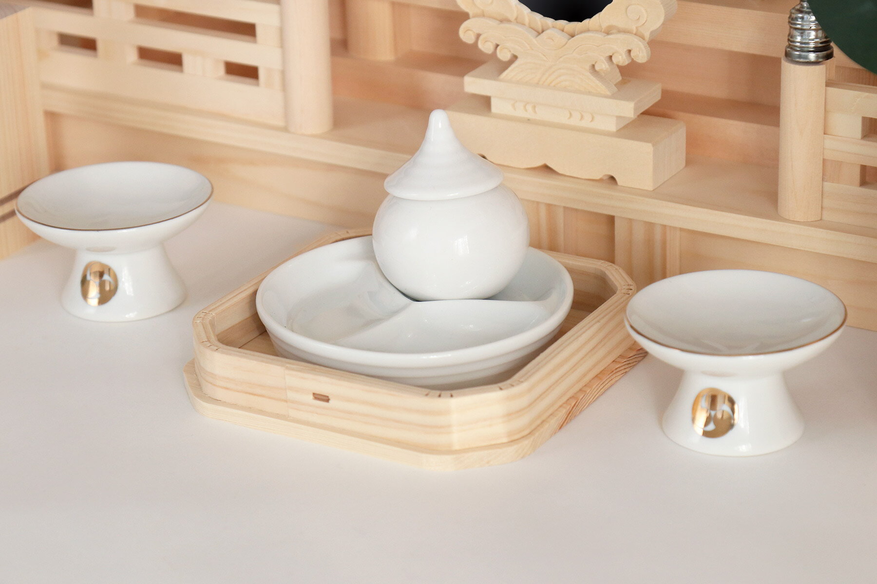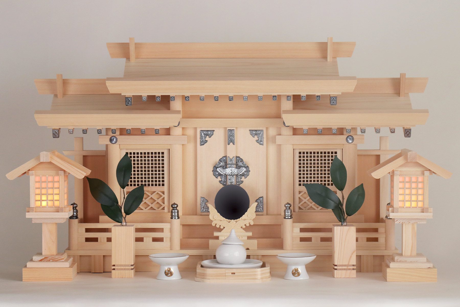 商品詳細 ご神木の威厳 伊勢神宮に奉納される「ご神木」は、長野県と岐阜県境をまたぐ木曽山系より産出されます。寒さの厳しいこの地で産出される檜は、目の詰まった美しい年輪をしつらえ、「木曽ひのき」「尾州桧」「官材」等と呼ばれる希少な木材として珍重されます。神棚用の素材として使用される場合は最も高級な製品に使用されています。 その貴重な桧材と優れた木工技術が集約された、美しいお宮、「美・木曽ひのき」シリーズ。上品な木肌と落ち着いた光沢が高級神棚ならではの趣を演出しています。柾目と板目を使い分けた、職人の技と心意気をも感じる事の出来る工芸品。 伝統美、三社宮 格子扉とシルバー金具で彩られた、とても美しい三社のお社です。金色金具にはない、落ち着いた趣き。横幅は69cmと迫力のある外観ですが奥行きを抑えた超・薄型設計。お部屋に設置した際は圧迫感がなく、すっきりと収まります。また、棚板や設置場所の奥行きスペースが小さい時でも、手前に神具一式をゆったりと置くことができます。 神具も一流を一式 神具は巴紋の盃と「水・米・塩」を一緒に盛り折敷でお供えする「神具セット・ともえ 」に、柏手を打つと炎が揺らいで灯る「柏手灯ろう」がセットとなっています。灯ろうは15秒後に自動消灯してスイッチのオンオフが不要、当店オリジナル(実用新案登録済み)の東濃桧で作られた工房手作り、当店大好評の神具一式です。神鏡は神社と同じ真鍮製の鏡。高級桧材の伝統的なお社と和モダンな神具、雄大に厳かにお祀りください。 セット内容 お社本体 巴柄 三盛り陶器 (水・米・塩) 巴紋盃 2寸一対 (お神酒) 桧製 折敷4寸 桧製 榊立て(中) (造花榊付属) 上神鏡 2寸 柏手灯籠 サイズ約(cm)神棚の大きさ 高さ40.5 幅69 奥行16 お神札が入るスペース 中央:高さ34 幅10 奥行4.5 左右:高さ28 幅8 奥行4.5 注意事項 ■ご注文のタイミングによりましては製造元より取り寄せ後の配送となり、お届けにお時間をいただく場合がございます。 その場合、当店から納期のご連絡をさせて頂きますが、お急ぎのお客様はご注文前に納期をお問い合わせください。ご神木の威厳 伊勢神宮に奉納される「ご神木」は、長野県と岐阜県境をまたぐ木曽山系より産出されます。寒さの厳しいこの地で産出される檜は、目の詰まった美しい年輪をしつらえ、「木曽ひのき」「尾州桧」「官材」等と呼ばれる希少な木材として珍重されます。神棚用の素材として使用される場合は最も高級な製品に使用されています。 その貴重な桧材と優れた木工技術が集約された、美しいお宮、「美・木曽ひのき」シリーズ。上品な木肌と落ち着いた光沢が高級神棚ならではの趣を演出しています。柾目と板目を使い分けた、職人の技と心意気をも感じる事の出来る工芸品。 伝統美、三社宮 格子扉とシルバー金具で彩られた、とても美しい三社のお社です。金色金具にはない、落ち着いた趣き。横幅は69cmと迫力のある外観ですが奥行きを抑えた超・薄型設計。お部屋に設置した際は圧迫感がなく、すっきりと収まります。また、棚板や設置場所の奥行きスペースが小さい時でも、手前に神具一式をゆったりと置くことができます。 神具も一流を一式 神具は巴紋の盃と「水・米・塩」を一緒に盛り折敷でお供えする「神具セット・ともえ 」に、柏手を打つと炎が揺らいで灯る「柏手灯ろう」がセットとなっています。灯ろうは15秒後に自動消灯してスイッチのオンオフが不要、当店オリジナル(実用新案登録済み)の東濃桧で作られた工房手作り、当店大好評の神具一式です。神鏡は神社と同じ真鍮製の鏡。高級桧材の伝統的なお社と和モダンな神具、雄大に厳かにお祀りください。 【セット内容】 ・お社本体 ・巴柄 三盛り陶器 (水・米・塩) ・巴紋盃 2寸一対 (お神酒) ・桧製 折敷4寸 ・桧製 榊立て(中) (造花榊付属) ・上神鏡 2寸 ・柏手灯籠 【サイズ約(cm)】 神棚の大きさ 高さ40.5 幅69 奥行16 お神札が入るスペース 中央:高さ34 幅10 奥行4.5 左右:高さ28 幅8 奥行4.5 【ご購入前に必ずご確認ください】ご注文のタイミングによりましては製造元より取り寄せ後の配送となり、お届けにお時間をいただく場合がございます。 その場合、当店から納期のご連絡をさせて頂きますが、お急ぎのお客様はご注文前に納期をお問い合わせください。