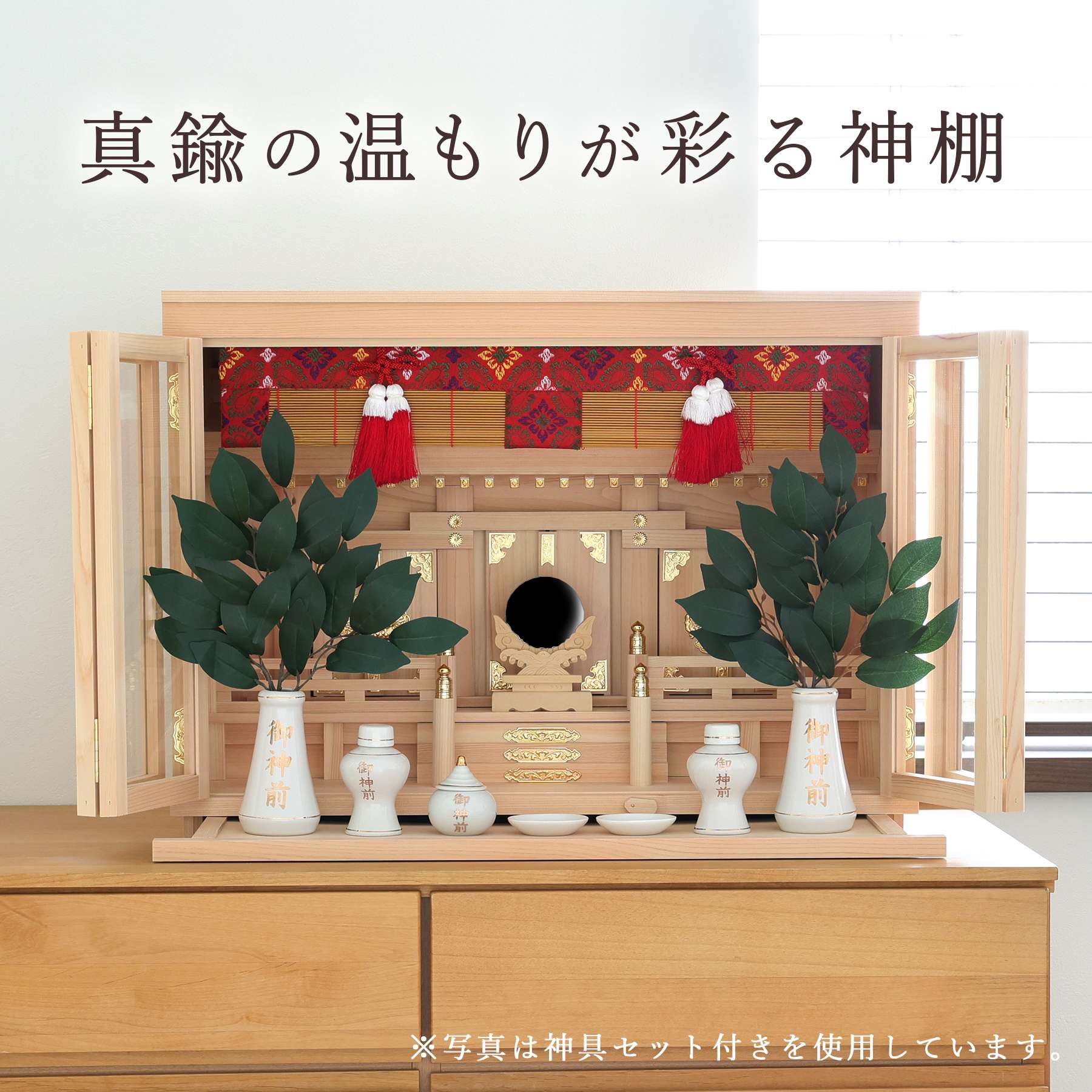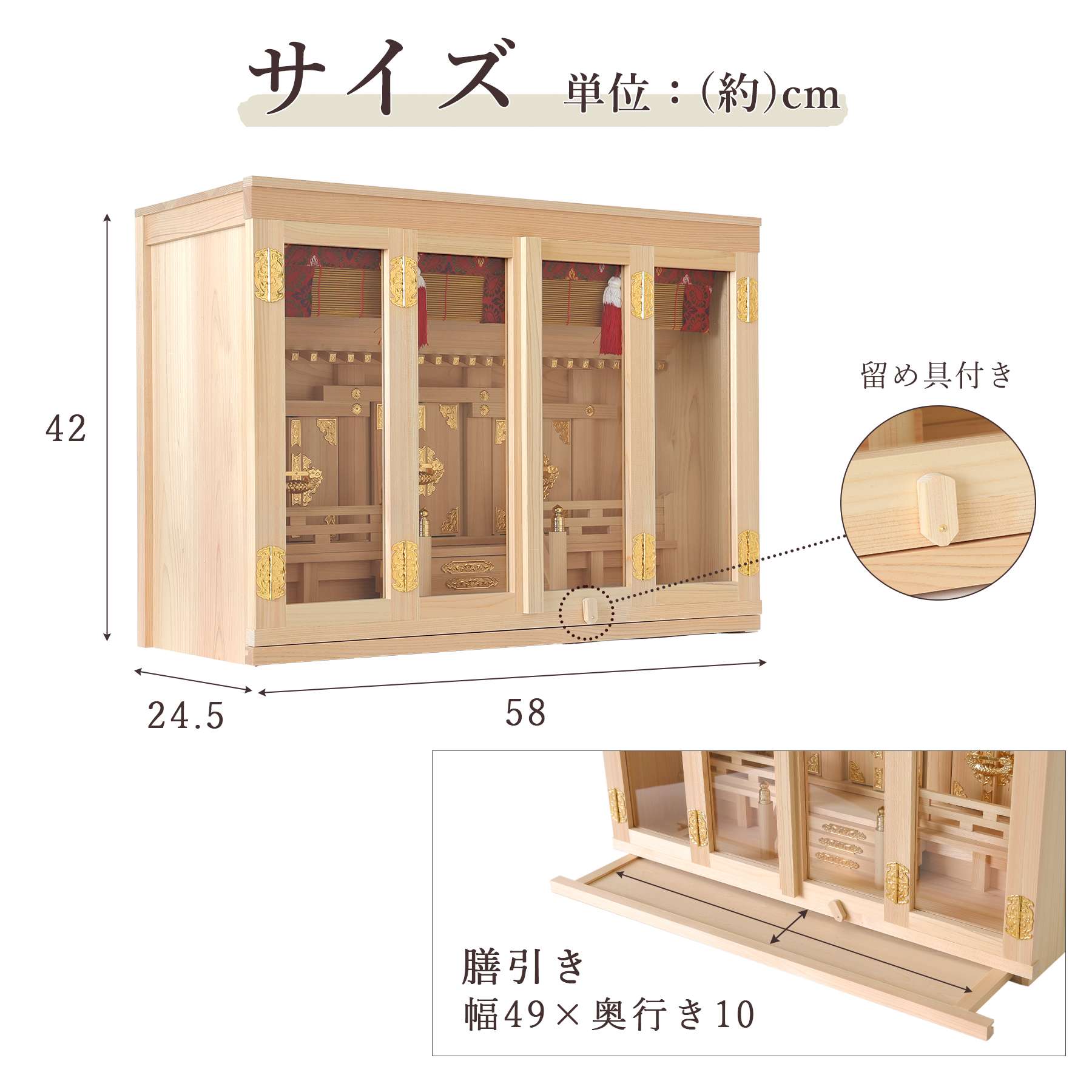 商品詳細 神社と同じ真鍮金具を使用した格式高い神棚 5つの特徴 ・真鍮製の金具熟練の職人による丁寧な仕上げ ・高品質な素材岐阜県東濃地域で産出される良質な「東濃ひのき」を使用 ・実用的な設計膳引き付きでお供え物の整理・配置が容易 ・お神札を納めやすい扉が取り外せる構造 ・桔梗柄の御簾和の趣を感じさせるデザイン この神棚は、伝統的な職人技と美しい真鍮製金具が融合した格式高い一品です。 真鍮製の金具は、実際に神社で使用されているものと同じ仕様を採用。伝統的な意匠と美しい輝きが調和した仕上がりとなっています。 神棚本体には香り豊かで耐久性の高い「東濃桧(ひのき)」を使用しており、木目の美しさと清らかな香りが祈りの場を一層引き立てます。 扉には透明なガラスが使用され、埃や汚れを防ぎつつ、内部の神具や装飾を美しく引き立てます。 また、膳引きが付いているため、お供え物の整理や配置が簡単に行える設計となっています。 お札を祀るスペースには仕切りがなく、複数のお神札を並べやすい構造になっているため、神棚内部がすっきりと整います。また、3枚の扉が手前に外せる構造になっているため、お札の出し入れが簡単で、日々の祀りや交換の際にもスムーズです。 桔梗柄の御簾は和の趣を感じさせるデザインで、神棚に気品と温かみを添えます。 伝統美と機能性を兼ね備えたこの神棚は、家庭やオフィスに格式と清らかさをもたらす、祈りの場にふさわしい逸品です。 材質 東濃桧 サイズ約(cm) お社本体:高さ42 幅58 奥行24.5 引出し部分:幅49 奥行10 お札の入るスペース:高さ28.5 幅52 奥行3.5 注意事項 お支払方法に代引きはお選びいただけません。 お神札は付属いたしません。 送料 「送料ご案内ページ」をクリックしてご確認ください。【ご購入前に必ずご確認ください】お支払方法に代引きはお選びいただけません。お神札は付属いたしません。
