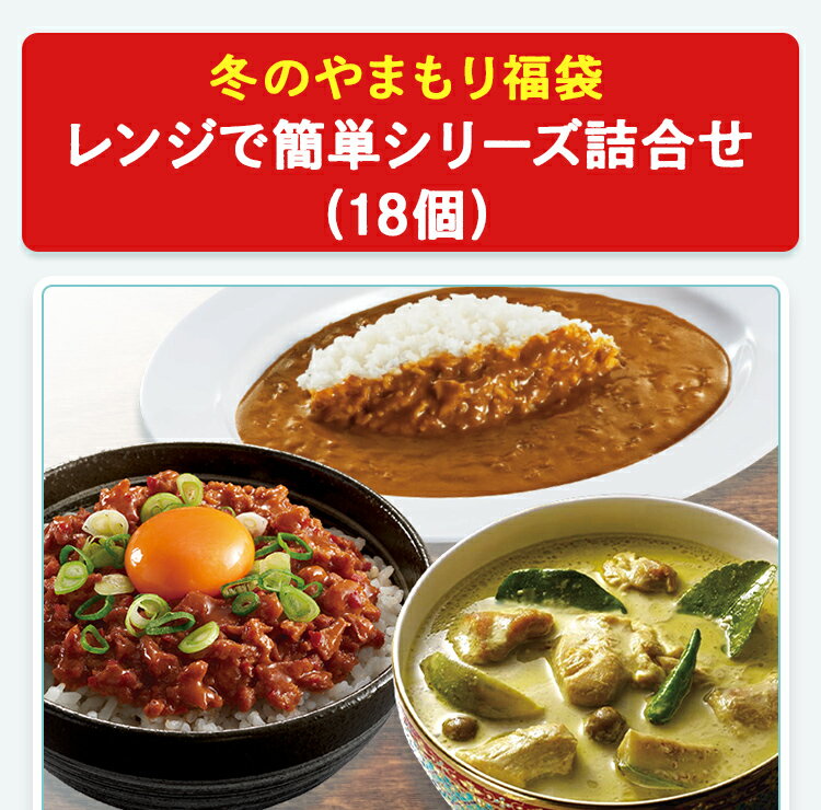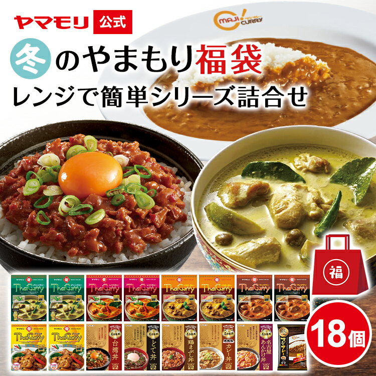 【クーポン最大5000円】 冬のやまもり 福袋 レンジ で簡単シリーズ 詰合せ (18個) 2026 2025 タイカレー 5種×2, 神田カレー マジカレー , 名古屋丼5種(台湾・どて・鶏まぶし・カレー・あんかけ ) セット レトルト タイ料理 名古屋めし 食品