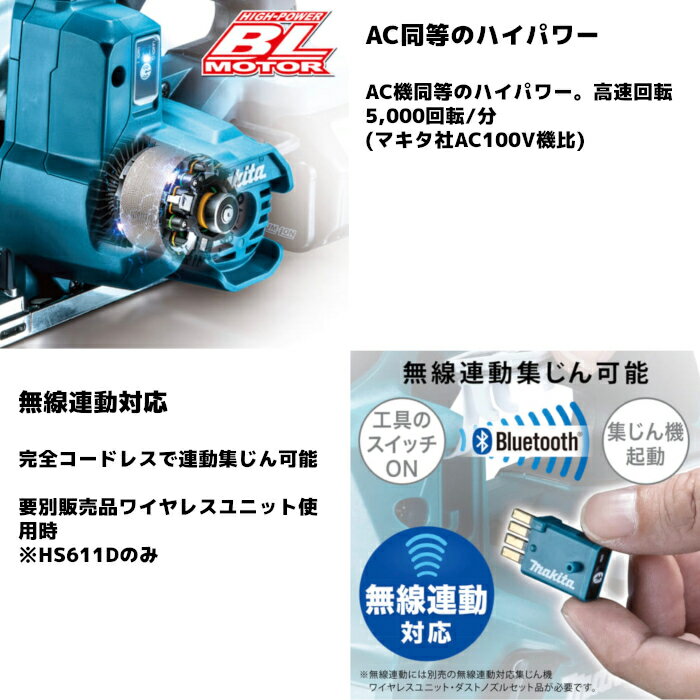 商品情報 メーカー名マキタ(makita) モデルHS610DZ 無線連動非対応 カラーHS610DZ [青] ノコ刃寸法外径165mm (155mm~165mm) ※使用できる刃物径 内径20mm 最大切込深さ90°時:57mm45°時:41mm 傾斜左5°:46.5mm 回転数[回転/分]5,000 電圧(V)直流18 1充電当たりの作業量(目安)※1米松(厚さ50x幅300mm)約195本 質量(kg)3.0(バッテリ含) 標準付属品・鮫肌プレミアムホワイトチップソー(A-64353)・六角棒スパナ5(783203-8)・平行定規 別販売品・196995-4 ダストノズルセット品 (集塵機に接続する際に必要)・199400-0 フックセット品 (単管や梯子に掛ける際に必要) 検索用キーワード丸ノコ、丸のこ、まるのこ ※1 数値は参考値です。バッテリの充電機状態や、作業状況により異なります