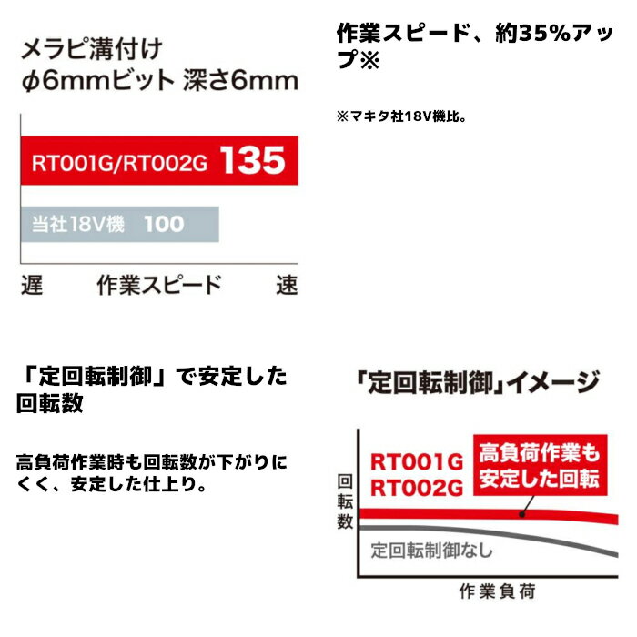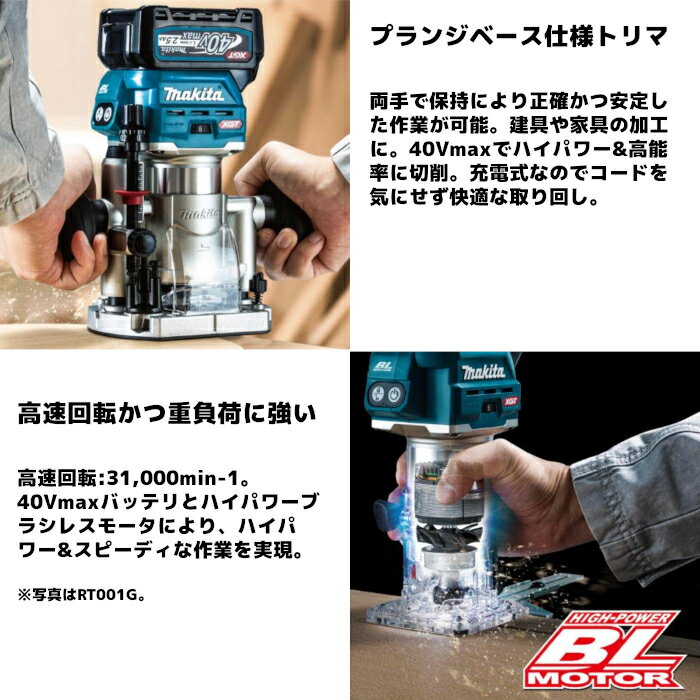 商品情報 メーカー名マキタ(makita) 商品名充電式トリマ プランジベース仕様 品番RT002GZ本体のみ(バッテリ・充電器・ケース別売) チャック孔径6mm・8mm 回転数10,000~31,000 回転/分 電圧直流36V(40Vmax)※1 本機寸法(長さx幅x高さ)110x227x282mm 質量3.1kg(バッテリ含む) 標準付属品 ・ストレートビット6 ・ストレートガイド(プランジベース用) ・トリマガイド ・ダストノズル(プランジベース用) ・テンプレットガイド16 ・コレットコーン8(軸径8mmビット用) ・スパナ22、13(各1本) 1充電当たりの作業量(目安)※2[パーティクルボード(厚:9mm)]約36m ※1 40Vmaxは満充電時のバッテリ電圧を表しています。 ※2 数値は参考値です。バッテリの充電状態や作業条件により異なります。