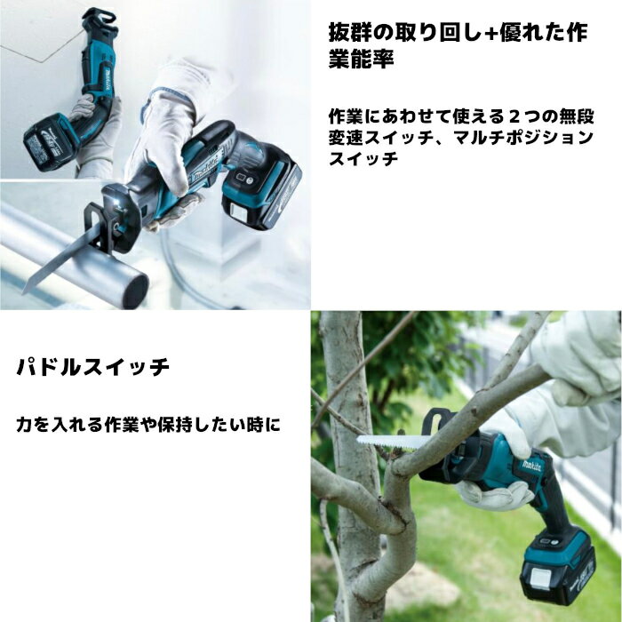商品情報 メーカー名マキタ(makita) モデルJR184DRGT 切断能力パイプ:φ50mm木材:厚さ50mm(152mmブレード使用時) ストローク数0〜3,000[回/分] ストローク13mm 本機寸法398x81x220(長さx幅x高さmm) 電源直流18V 1充電あたりの作業量(目安)※1木材(2×4):約100本鋼管(Φ25.4×厚さ1.2mm):約340本塩ビ管(Φ48×厚さ4mm):約560本 質量1.8kg(バッテリ含) 標準付属品・バッテリ(BL1860B)・充電器(DC18RF)・レシプロソーブレード(BIM41/木材、プラスチック)・プラスチックケース・六角棒スパナ3 ※1 数値は参考値です。バッテリの充電状態や作業条件により異なります。
