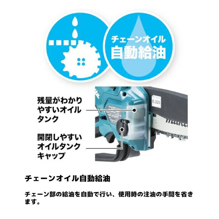 商品情報 メーカー名マキタ(Makita) モデルMUC029GRD 切断部 ガイドバー長さ150mm チェーンスピード8m/秒 [480m/分] チェーン形式80TXL-32E オイルタンク容量55mL 電源※1直流36V(40Vmax) 本機寸法※2(長さx幅x高さ)474x95x255mm 質量※22.1kg [BL4025装着時] 振動3軸合成値※34.6m/s2 1充電あたりの作業量(目安)※4ひば材 φ50mm約415本 [BL4025使用時] 標準付属品 ・バッテリ(BL4025)×1本 ・充電器(DC40RA) ・チェーン刃 ×1本(OREGON社製) ・ガイドバー ・チェーンカバー ・チェーンオイル ※1 40Vmaxは満充電時のバッテリ電圧を表しています。 ※2 バッテリ、チェーン刃、ガイドバー含む。 ※3 EN62841-4-1規格に基づき測定。 ※4 数値は参考値です。バッテリの充電状態や作業条件により異なります。 別販売品 クイック脱着フック[A-78988]カラビナ等に片手で脱着可能な本機装着タイプ。 充電式ハンディソー用ホルスタ[A-76314]100mm/150mm充電式ハンディソーを収納可能。ベルト装着タイプ。工具固定バンド付。