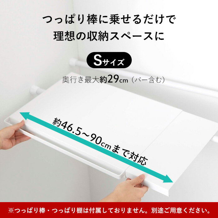 山崎実業 tower 伸縮 つっぱり棒用棚板 タワー S はこんな商品です。 手軽に収納スペースを増やすのに便利な、つっぱり棒やつっぱり棚。 そんな便利なアイテムを、さらに理想に近づけてくれるのが「伸縮 つっぱり棒用棚板 タワー」です。こちらは奥行スリムなSサイズ。 お手持ちのつっぱり棒やつっぱり棚に乗せるだけでスタイリッシュな収納ラックを作ることができます。 伸縮式なので、設置したいスペースの幅に合わせて調節も可能です。 ●北海道・沖縄・離島は追加送料がかかります。注文確認後、送料修正しご案内いたします。tower伸縮 つっぱり棒用棚板 タワー S 収納スペースをさらに理想に近づけてくれる、ありそうでなかったアイデア商品のつっぱり棒用の棚板。 収納スペースをプラスするとき、なにかと頼りになるつっぱり棒やつっぱり棚。 だけどどうしても漂ってしまう生活感...そのつっぱり棒を隠しながらまるで備え付けの棚のように見せてくれるのがこの棚板です。つっぱり棒やつっぱり棚の上にのせるだけでスタイリッシュな収納スペースを作ることができます。 伸縮式だから、使いたいスペースの幅に合わせて調節できるのもうれしいポイントです。 ※つっぱり棒・つっぱり棚は付属しておりません。別途ご用意ください。 使い方はとっても簡単。お手持ちのつっぱり棒やつっぱり棚の上に棚板を乗せるだけ。 あっという間にスタイリッシュな収納棚ができあがります。 ちょうどいいサイズのラックがないから、つっぱり棒でDIYをしよう!と思ったもののどうしても生活感が拭えないつっぱり棒...。こちらの専用の棚板を使うことで、元から備え付けであったかのようにスッキリとした収納スペースが実現します。 さらにうれしいのが、設置したいスペースに合わせて幅を調節できる伸縮式なところ。お引っ越しなどで設置する場所が変わっても、その場所に合わせて対応できます。 棚板としてしっかりとした容量のある奥行きはもちろん、ハンガーやフックを掛けられるハンガーバーも付いています。 ランドリールームなら、ハンガーを、トイレならスプレーなどお掃除アイテムを引っ掛けて。 そのまま掛けられるから出し入れもサッとできてスムーズに。 付属のフックで、ちょっとした小物も掛けられて、必要なものを使いやすく収納できます。 お手持ちのS字フックなどを活用しても使い方の幅が広がりそうですね。 こちらの棚板は、つっぱり棒やつっぱり棚が使える場所ならばどこでも使えます。 ランドリールームやトイレなど収納がなかったり、収納をもっと増やしたい場所に手軽に設置できて、スタイリッシュな収納棚としてしっかりと活躍してくれます。 【 設置について 】 製品の内寸は以下のようになっています。つっぱり棒を2本使う場合は間隔が狭すぎると不安定で危険なのでバランスよく配置してください。 また、つっぱり棒は壁から1cm以上離した場所に取り付けてください。 【 耐荷重について 】 つっぱり棒の場合 → 1本あたり5kg以上(つっぱり棒の場合つっぱり棒が2本必要です) つっぱり棚の場合 → 10kg以上のものをご用意ください <閲覧中>つっぱり棒用棚板 S つっぱり棒用棚板 L つっぱり棒用棚板 スリム つっぱり棒用棚板 ミニ テーブル下つっぱり棒用収納ラック つっぱり棒用バスケット 〇石こうボード壁対応浮かせるトイレ棚 タワー 〇コーナーハンガーラック タワー 石こうボード壁対応 〇伸縮棚下収納ハンガー タワー ⇒ 商品カテゴリー>収納雑貨 ⇒ towerで洗面・トイレ周りを整える ⇒ 突っ張り棒なら「ドローアライン」 [ NEW ] 大人気のtowerなど山崎実業の最新アイテムはこちら ●商品の詳細● 品 名 tower 伸縮 つっぱり棒用棚板 タワー S サイズ 約 幅46.5~90 × 奥行29(バー含む) × 高さ3cm[棚] 奥行 26.5cm(内寸:24.5cm) 重 量 約 2kg 材 質 スチール(粉体塗装) 耐荷重 ご使用のつっぱり棒・つっぱり棚の耐荷重から、本製品の重さ約2kgを引いた重さ カラー ホワイト / ブラック 入 数 1個 備 考 [対応製品] 約 幅46.5cm以上、奥行き24.5cm以内、耐荷重10kg以上のつっぱり棒・つっぱり棚(つっぱり棒の場合は1本あたりの耐荷重が5kg以上であること) ■注意点 ※つっぱり棒・つっぱり棚は付属しておりません。また、当店では突っ張り棒・つっぱり棚は取り扱っておりません為、別途ご用意ください。 ※ご使用の前に設置したい場所の寸法を必ずご確認ください。 ※お使いのつっぱり棒・つっぱり棚の耐荷重をご確認の上、耐荷重を超えた使い方はしないでください。 ※商品の色は、画像と実物とでは多少異なる場合がございます。色・イメージが違う等の理由による返品は一切お受けできません。予めご了承下さい。
