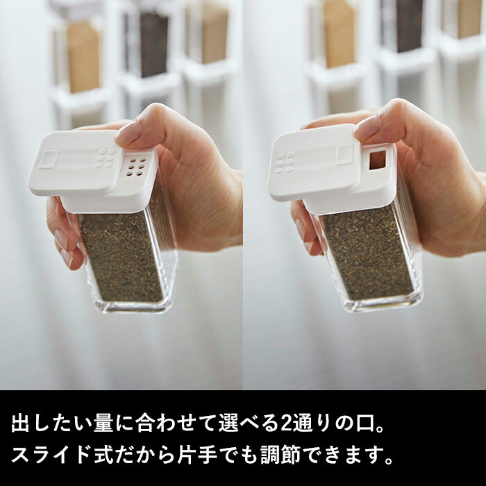 山崎実業 tower スパイスボトル タワー L はこんな商品です。 忙しい調理中でも片手で開いてふりふり。スムーズに使えて量の調節もできる調味料ボトルです。 振り出し口は2種類あり、少しずつ出したいときにも、ある程度の量を出したいときにも快適。 横並びに整頓しやすいスクエア型。スパイスの種類が増えてもキッチンをすっきりと見せてくれます。 ●北海道・沖縄・離島は追加送料がかかります。注文確認後、送料修正しご案内いたします。tower スパイスボトル タワー L あわただしく調理をしているときでも、片手だけで中身を振り出すことができる調味料ボトルです。 前後にスライドするタイプの蓋だから、片手に菜箸やお玉を持ったままの状態でも開けることができ、さらに量の調節もらくらく。 2通りの口があるから、少しずつでも、ある程度の量でも、簡単に出す量を調節できます。 容量は120ml。よく使う調味料入れるのに便利なLサイズです。 前後にスライドする蓋で2通りの出し方ができ、片手でも好みの量に使うことができます。 少しずつ出したい塩コショウにも、ある程度の量が出てほしい顆粒だしにも、ばっちり対応できる便利なデザイン。 もたもたしていられない調理中に作業をスムーズにしてくれます。 蓋を取り外せば広く口が開き、詰め替えをしたり、お手入れの際にも洗いやすい便利な仕様です。 収納のしやすさも大きな魅力。調味料やスパイスの量が増えてもミニマルに整理できるスクエア型です。 透明なプラスチック製だから、中身が分かりやすく、落としても割れにい毎日使いにはもってこいの機能性です。 使用頻度や使用量が違う調味料でもtowerシリーズで容器を合わせればスッキリ。それぞれにあった大きさのサイズで使いやすく、見た目も統一感のあるキッチンに。 (左)小麦粉&スパイスボトル タワー>>>商品を見る (右)スパイスボトル タワー>>>商品を見る \マグネットが付けられるキッチンにはこちらもおすすめ/ 単品・4個SET >> 単品< 閲覧中 > 単品 >> 4個SET >> 4個SET >> 単品 >> 単品 >> 2個SET >> 3個SET >> [ NEW ] 大人気のtowerなど山崎実業の最新アイテムはこちら ●商品の詳細● 品 名 tower スパイスボトル タワー L サイズ 約 幅4.8 × 奥行き4.8 × 高さ10 cm 容 量 約 120ml 材 質 容器:アクリル樹脂蓋上下:ポリエチレン 重 量 約 90g 耐冷熱 -40℃~90℃ カラー ホワイト/ブラック 入 数 1個 備 考 インデックスシール付属 ■注意点 ※食器洗い乾燥機・電子レンジ・冷凍庫にはご使用いただけません。 ※熱湯、アルコール消毒、漂白剤、水へのつけ置きはお避け下さい。 ※完全密封するものではありません。 ※ご使用前に中性洗剤などで洗って、水分をしっかりとふき取り、十分に乾燥させてからご使用ください。 ※製品の蓋をもって持ち上げないでください。 ※アルコール類、強い酸性、アルカリ性を多量に含む液体の保存はお避け下さい。 ※レモン等の柑橘類の皮に含まれるテルペンまたは油脂によって変質することがあります。 ※直射日光や火が直接当たる場所や高温になる場所では使用しないでください。 ※商品の色は、画面上の画像と実物とでは多少異なる場合がございます。色・イメージが違う等の理由による返品は一切お受けできません。予めご了承ください。