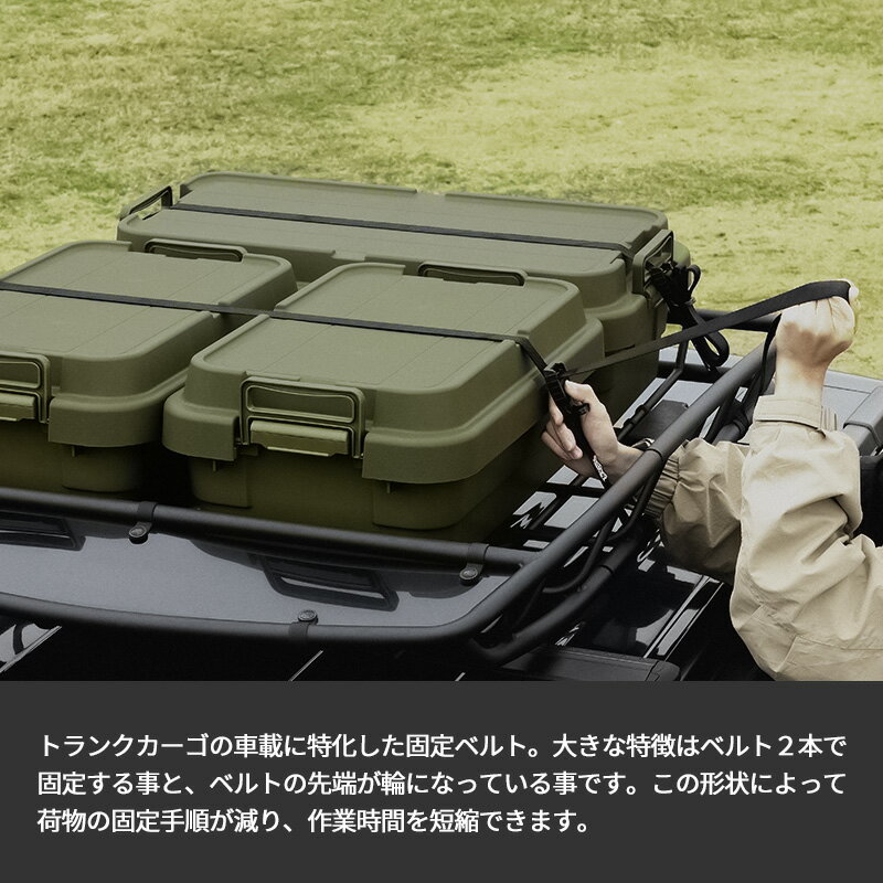 トランクカーゴの車載に特化した固定ベルト。効率のいい固定と荷解きができることを追求し、ルーフキャリアをさらに快適に使用できるようになりました。 ●北海道・沖縄・離島は追加送料がかかります。注文確認後、送料修正しご案内いたします。TRUNK CARGO / トランクカーゴ ルーフキャリアベルト 効率の良い固定と荷解きができることを追求した、トランクカーゴの車載に特化した固定ベルト。2本のベルトで固定するカムバックル式で簡単に荷物の固定ができ、作業時間を短縮できます。固定した後のベルトの余り、使わない時はきれいにまとめておけるファスナーバンドも付属。車でアウトドアやレジャーに出かけることが多い方におすすめのアイテムです。 車載する荷物をしっかり固定 効率よく作業がすすむ ルーフキャリアベルト ルーフキャリアベルトは、荷物車載の負担を軽減することを考えて開発されました。先端が輪になった2本のベルトで留めるカムバックル式を採用。荷物の固定手順が少なくなり、手間のかかる荷留めもスムーズに終わります。 余ったベルトも すっきりとまとまる 専用バンド付き 固定して余ったベルトは、付属のファスナーバンドでまとめる事で邪魔になりません。使い終わった後の長いベルトもまとめておけるので、省スペースにすっきりと後片付けすることができます。 大切な車を 傷つけない工夫 カムバックルを覆うPVC製のカバーによって、車への傷つき対策がされています。取り付け時にバックルを落としてしまっても車体を傷つけにくいので、安心してお使いいただけます。 ベルトの取り付け方 車にトランクカーゴを載せてお出かけする時に便利なルーフキャリアベルト。荷物の固定も荷解きも効率よくでき、ルーフキャリアをさらに快適に使用できるようになります。 詳しい取り付け方はページ内の動画でもご確認いただけます。 トランクカーゴ バリエーション 20S容量 22L 30S容量 30L 50S容量 50L 70S容量 70L 30S LOW容量 18L 50S LOW容量 30L 70S LOW容量 40L 仕切板LOW ルーフキャリアベルト 20S 30S 50S 70S ●商品の詳細● 品 名 トランクカーゴ ルーフキャリアベルト サイズ 外寸:約 幅2725 × 奥行き44 × 高さ30mm(ベルトの幅:25mm) 長さ:ベルトS(バックル付き) 0.4m・ベルトL 2.3m 破断荷重 約 280kgf 使用荷重 約 70kg 材 質 ポリエステル、PVC、POM 重 量 約 134g カラー ブラック 入 数 1個 備 考 日本製 ■注意点 ※製品のサイズをご確認のうえ、ご注文ください。 ※商品の色は、画面上の画像と実物とでは多少異なる場合がございます。色・イメージが違う等の理由による返品は一切お受けできません。予めご了承ください。